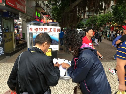 【明慧网二零一六年四月二十日】为了让更多民众了解中共迫害法轮功的罪恶,并声援控告江泽民大潮,自二零一五年八月份起,澳门法轮功学员在澳门世界遗产景点玫瑰堂前地、大三巴等地征集签名,得到了澳门各界市民的支持,其中包括澳门立法会议员区锦新及民运人士利建润等。