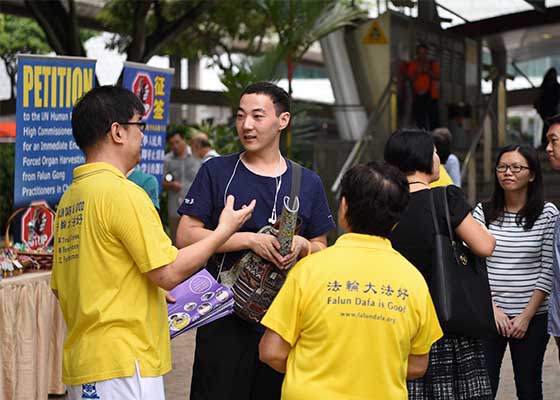 二零一六年四月二十日,为纪念四二五万名法轮功学员和平上访十七周年,新加坡法轮功学员在芳林公园举办活动,传播真相。