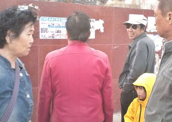 辽宁省阜新市行人观看诉江展板;北京街头见到“法轮大法好”;铁岭大街小巷的真相胶贴和展板……