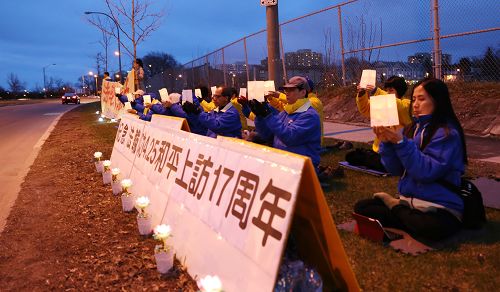 ![]() 图1-2:二零一六年四月二十五日傍晚,加拿大首都渥太华的法轮功学员在驻加中使馆前纪念“四二五和平上访”十七周年。 |