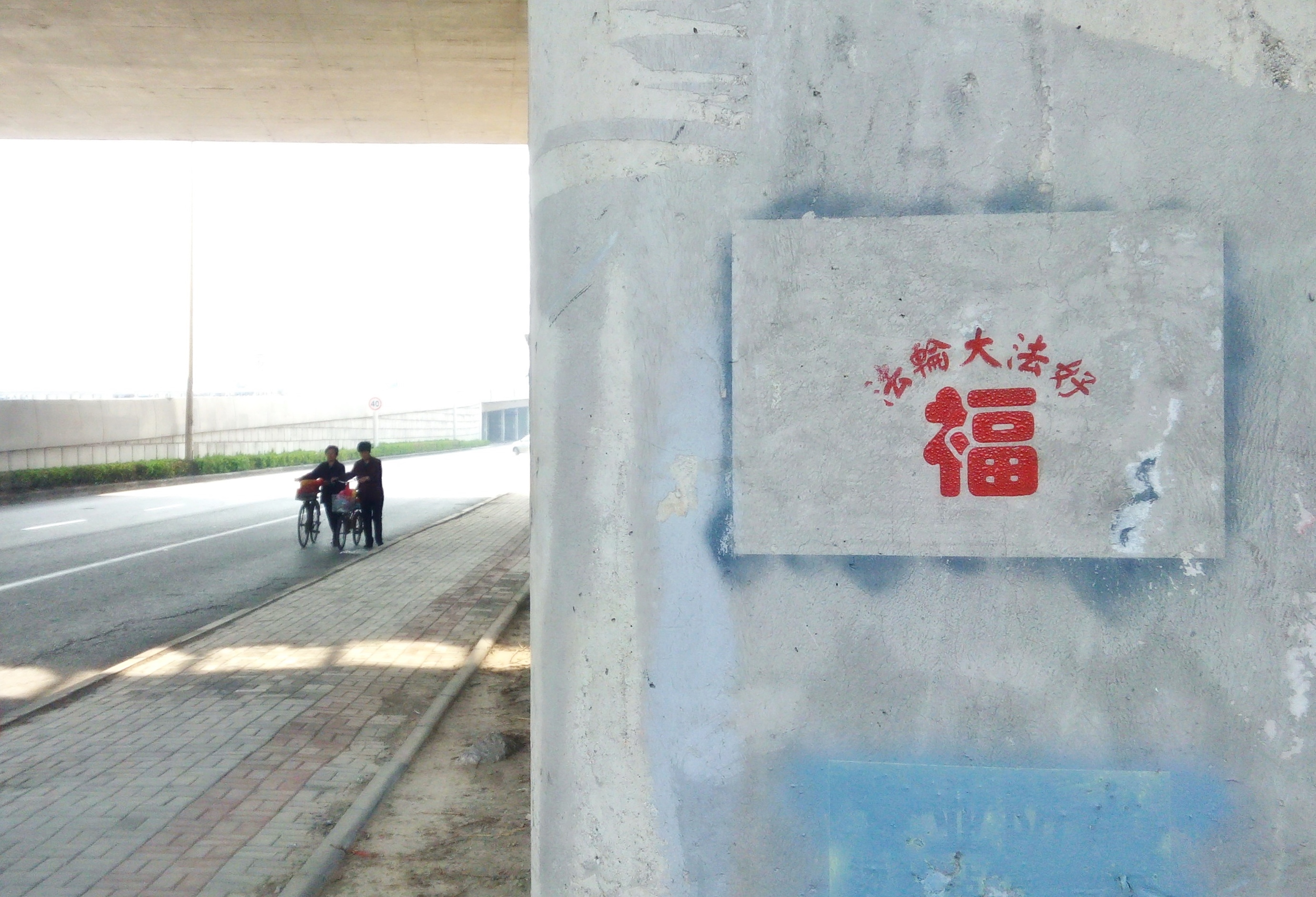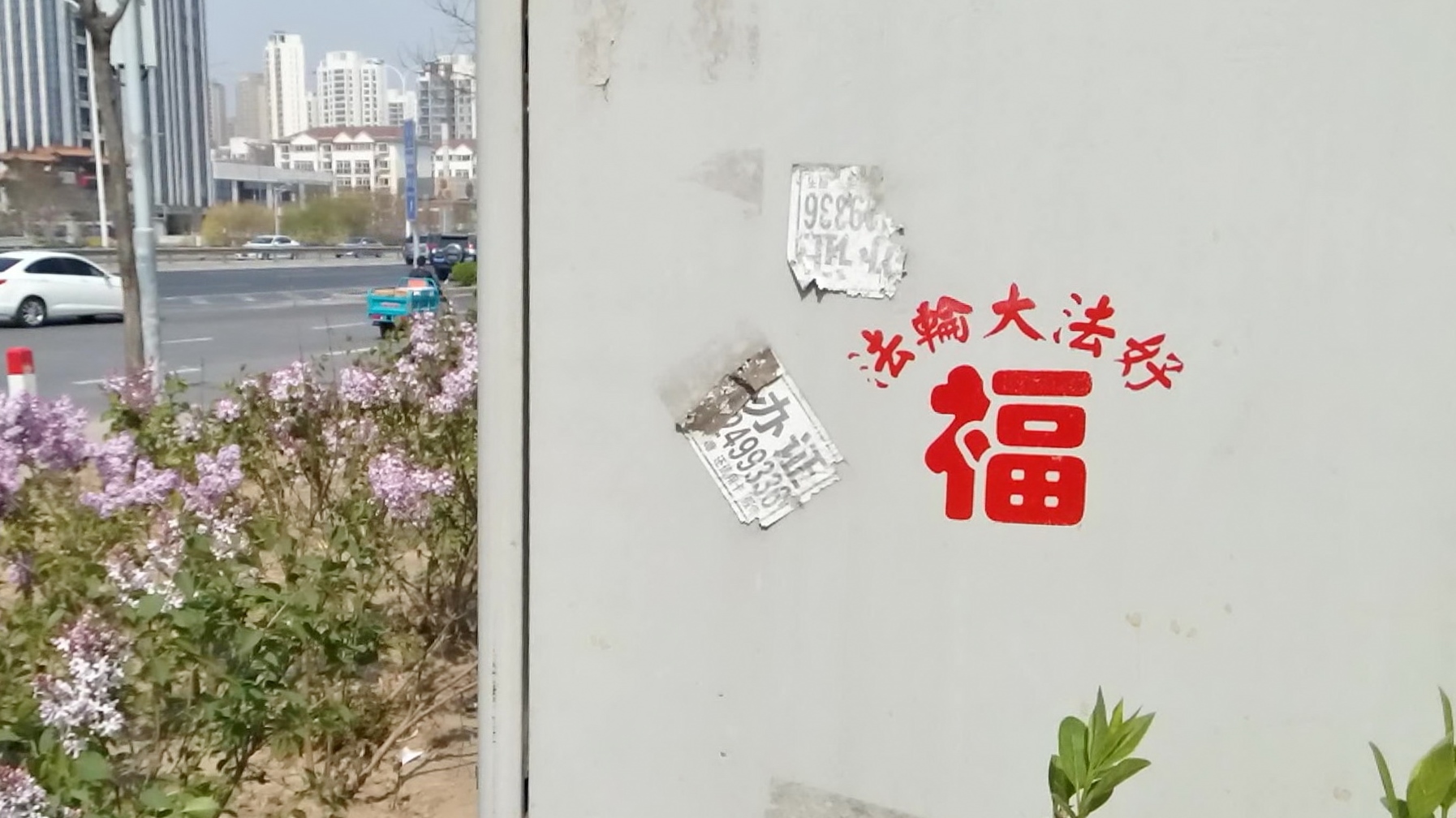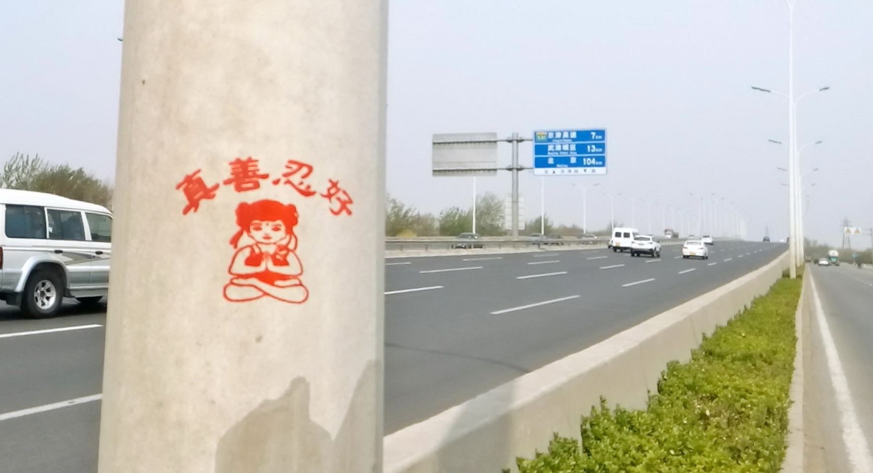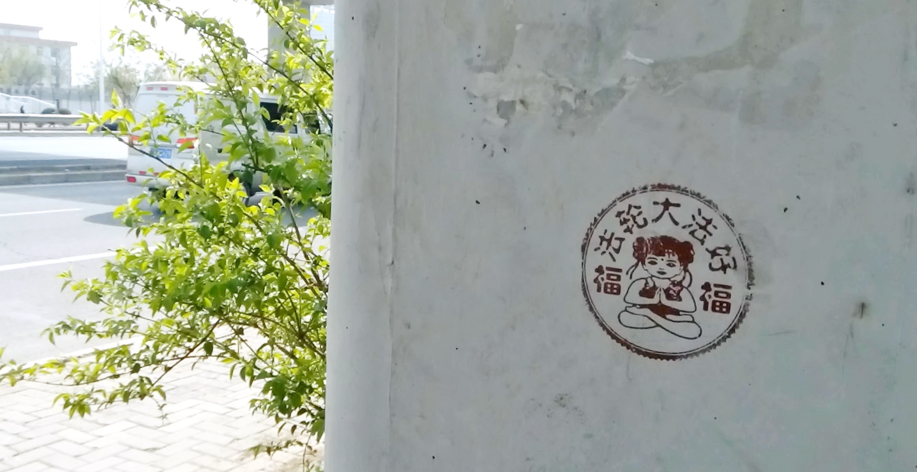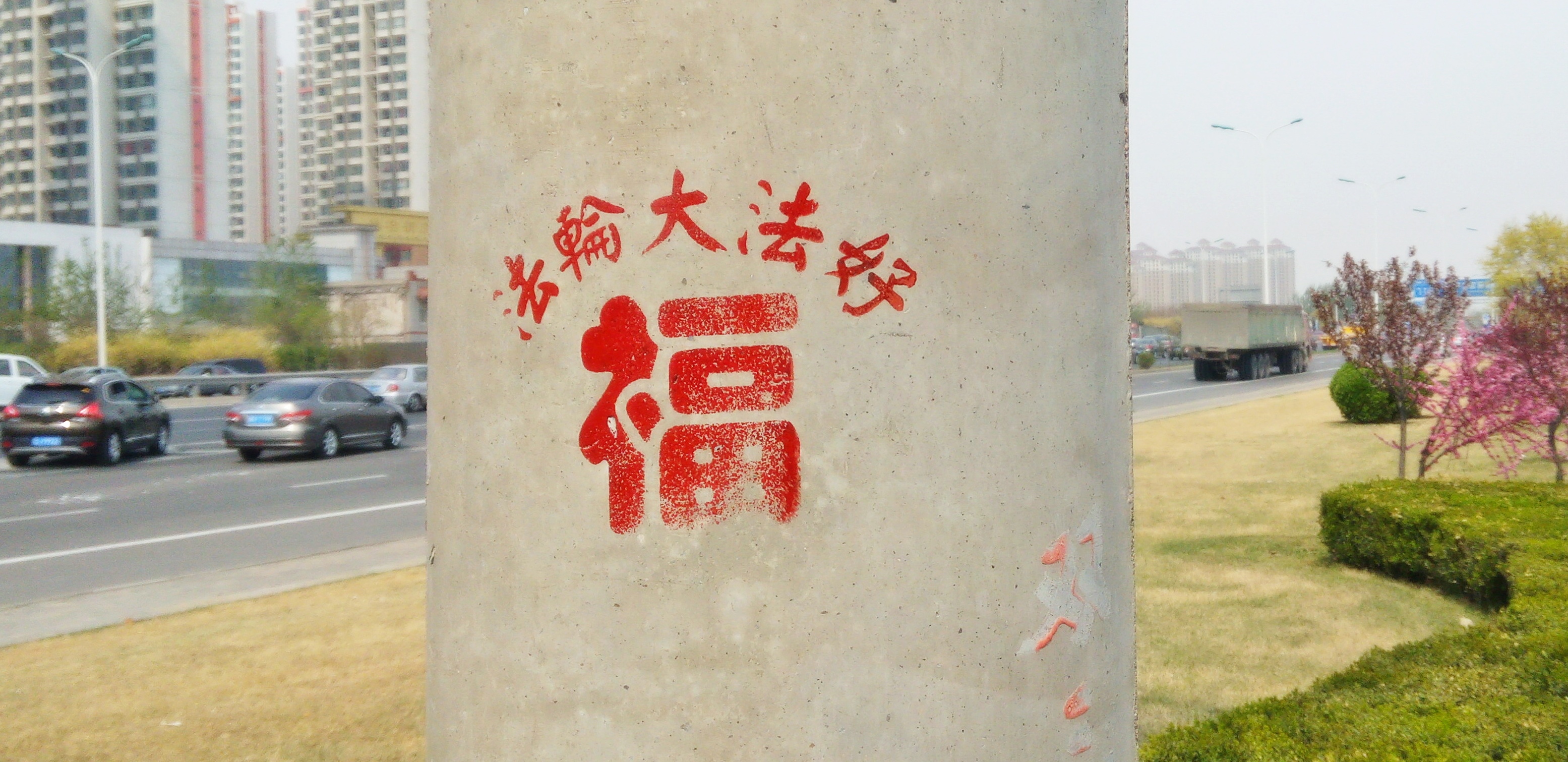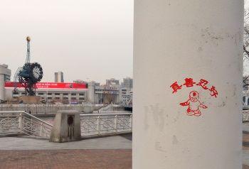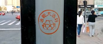 【明慧网二零一六年四月二十七日】天津,二零一六年的春天来的特别早,人们在感叹时间飞快的同时,也在惬意的感受着春风、春雨、树梢的嫩芽及悄悄长出的小草。人们还发现津城还出现了一处处配有天使、童子,莲花和大福字等图案的法轮大法真相标语。它们点缀在灯柱、桥墩、电线杆、墙壁上,给人赏心悦目的美感,也带给人们希望。