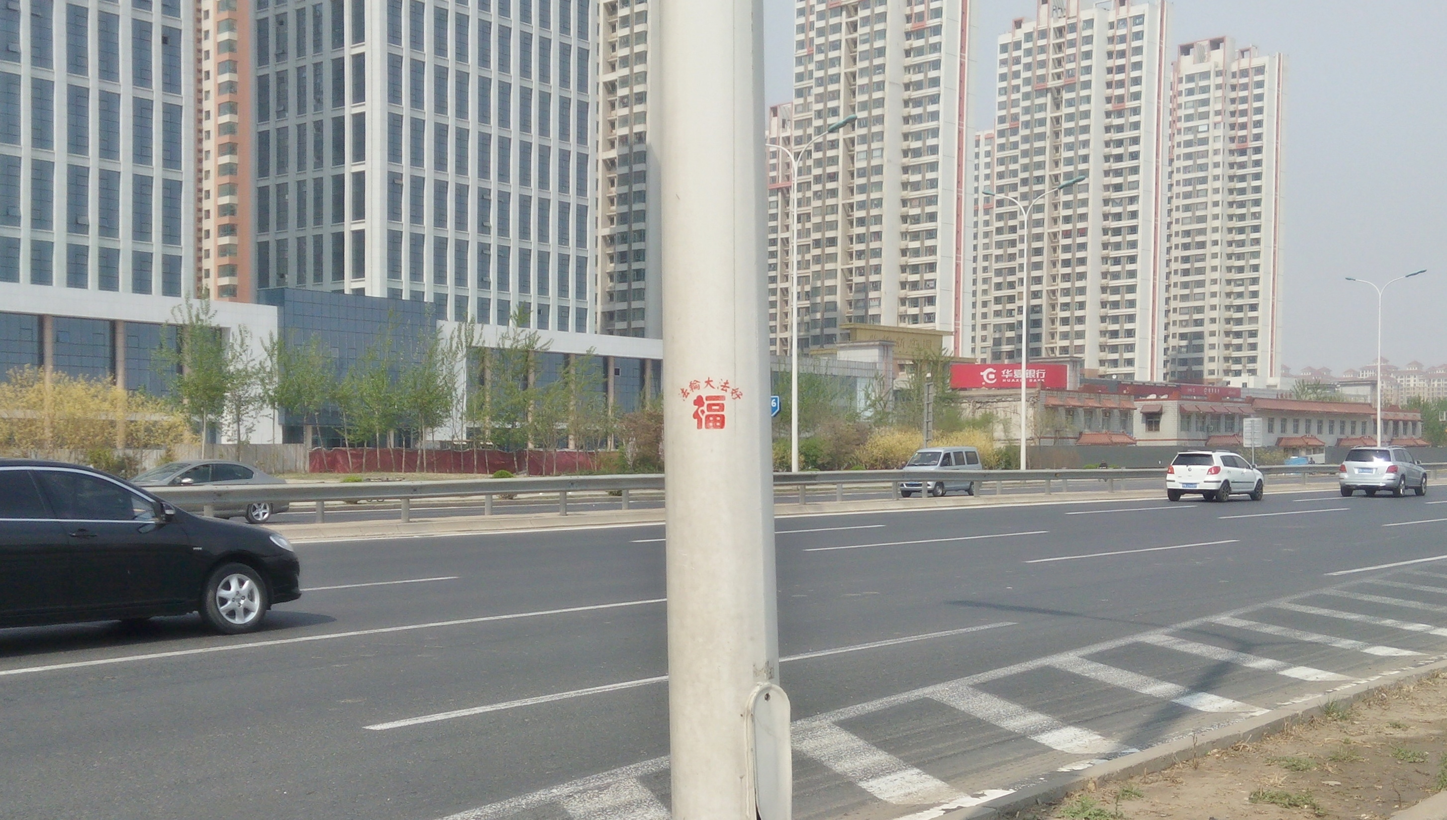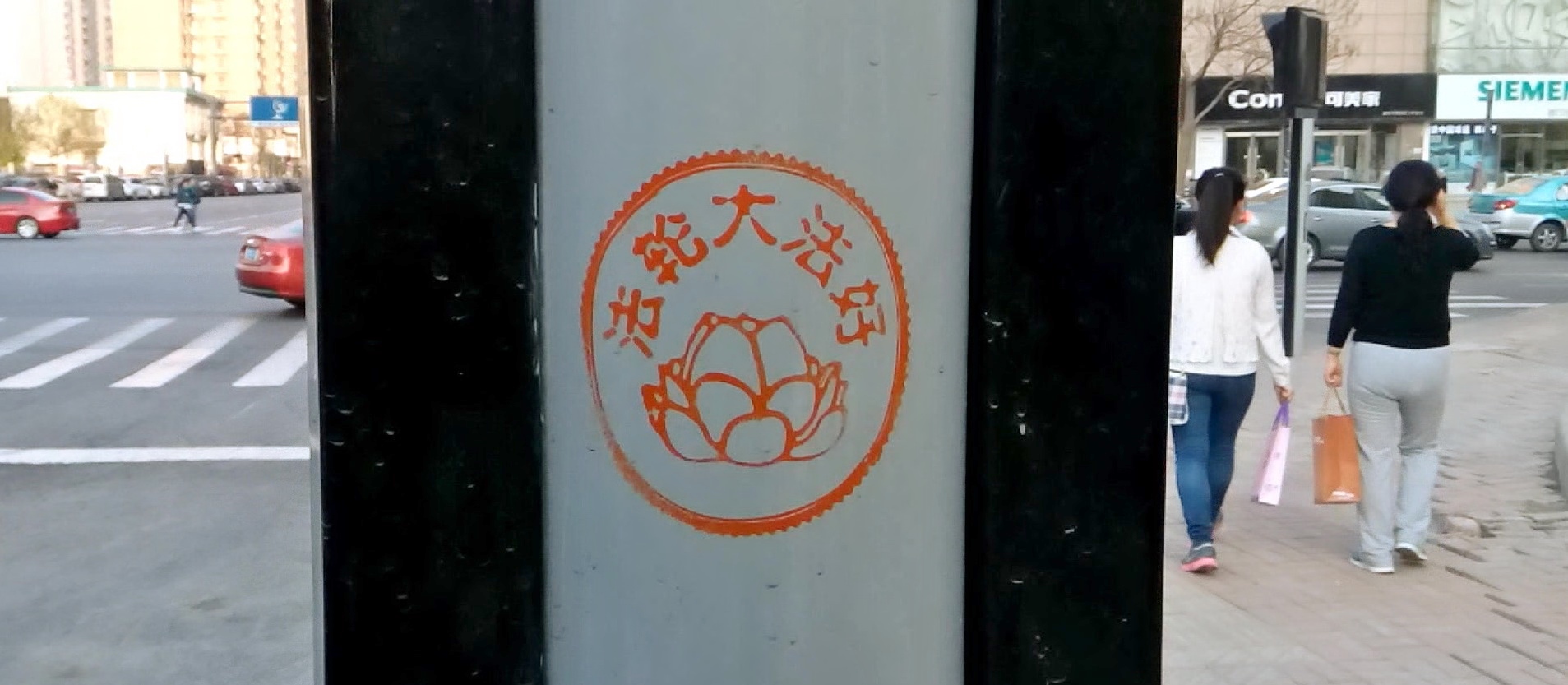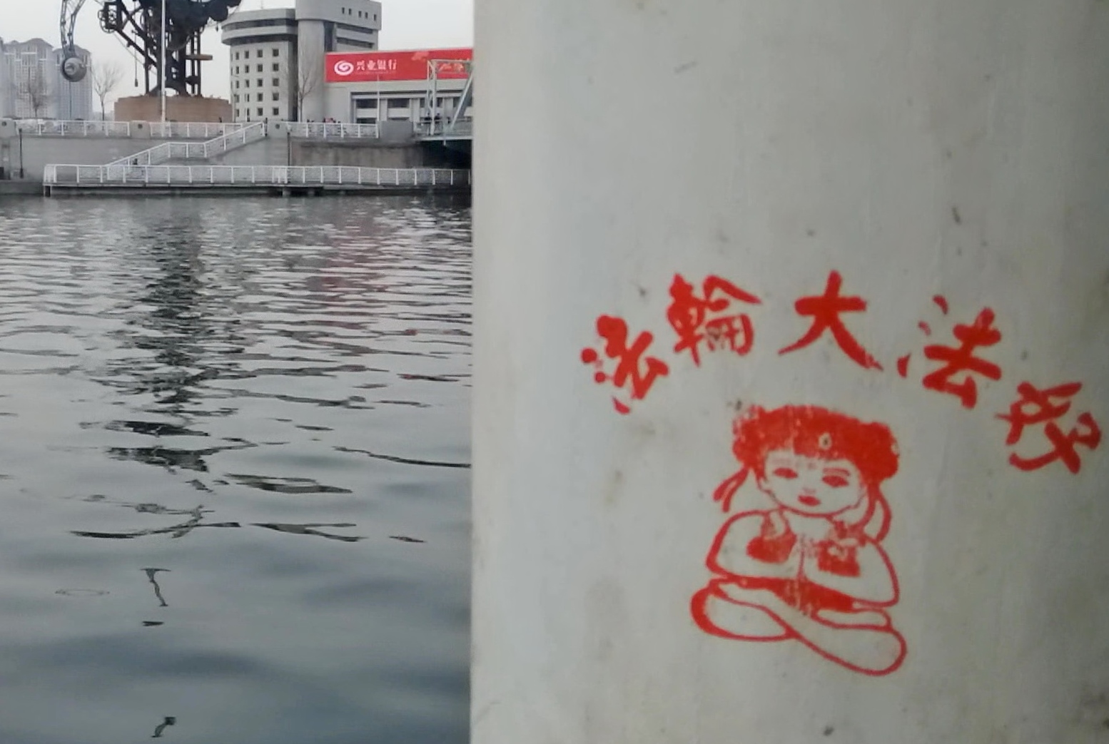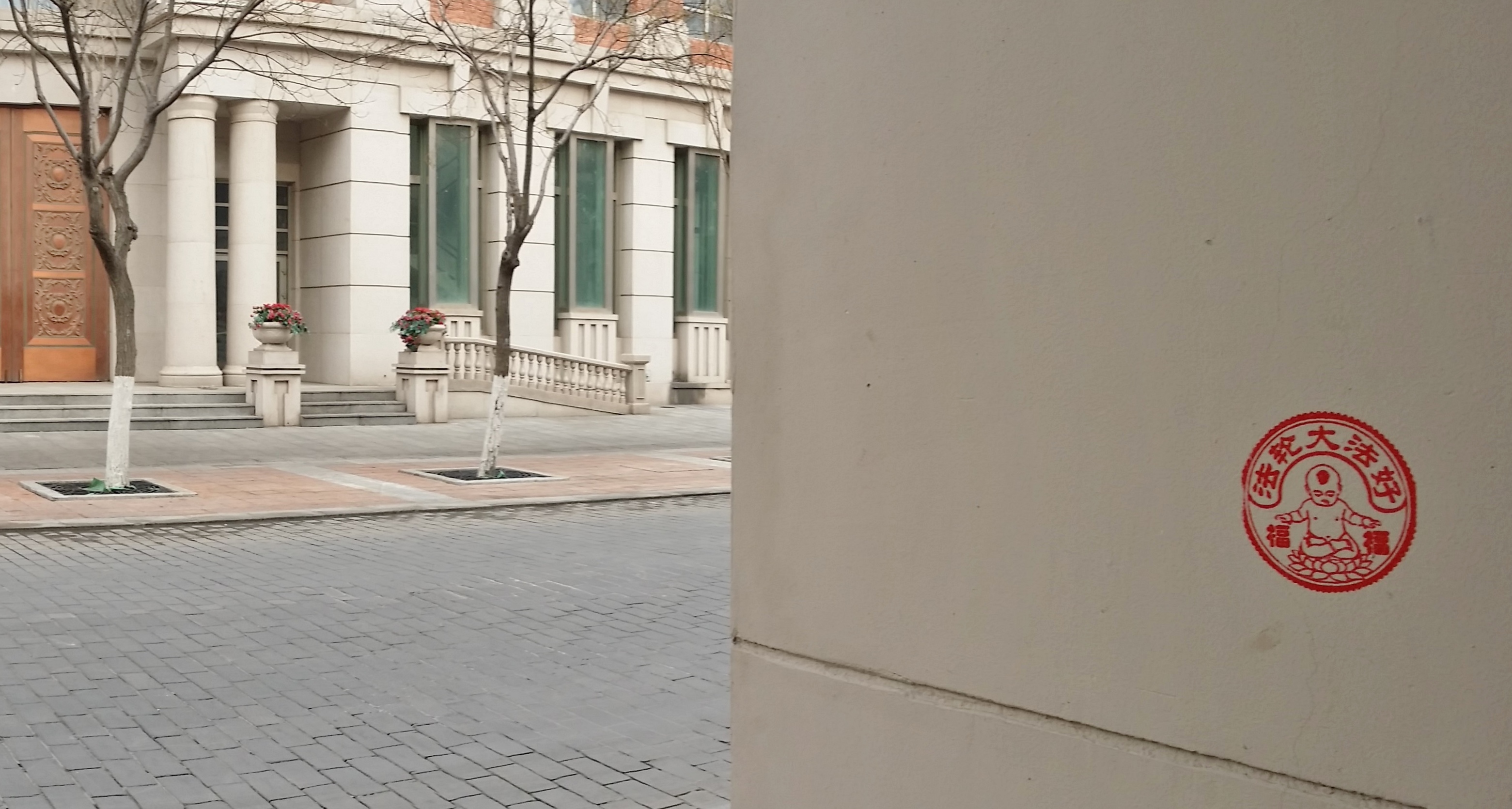 【明慧网二零一六年四月二十七日】天津,二零一六年的春天来的特别早,人们在感叹时间飞快的同时,也在惬意的感受着春风、春雨、树梢的嫩芽及悄悄长出的小草。人们还发现津城还出现了一处处配有天使、童子,莲花和大福字等图案的法轮大法真相标语。它们点缀在灯柱、桥墩、电线杆、墙壁上,给人赏心悦目的美感,也带给人们希望。