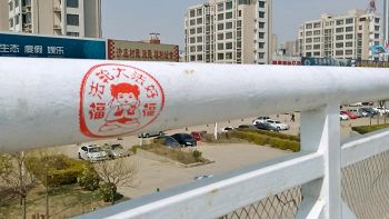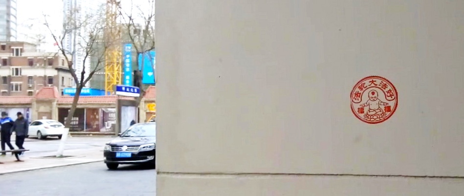备注:这种墙体大章方式,借鉴了剪纸的样式,图文并茂,形象逼真且优美,发挥了户外标图的作用,做起来相对而言更安全、高效、持久。采取了图形和文字结合,图案化的设计。图案部分采用线条形式的图案,选取图片后用PS将它做成线条化、白描或图章,突出边线等方式,达到方便雕刻即可。