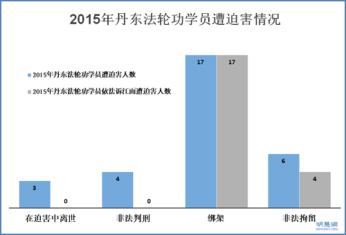 据不完全统计,2015年丹东法轮功学员因长期的迫害,含冤离世的、遭绑架、非法拘留、判刑共有三十人,其中因为诉江遭受迫害的占70%。