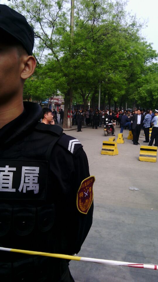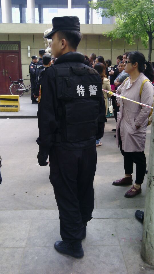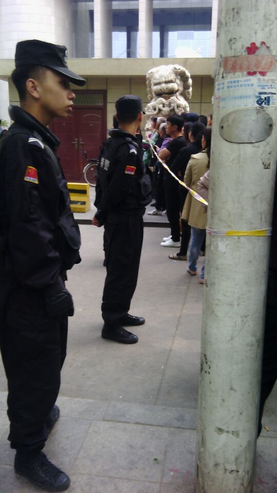 法院门前戒备森严,动用大批特警拉起警戒线,左右五十米内不许人靠近,就连马路对面也有特警驱逐行人。还有好多便衣,有的便衣摄像。当指出他们违法,说既然录像,敢拿到电视上播放吗?让人们看看你们贴公告说公开开庭,为什么不让我们旁听?他们哑口无言,躲到树后继续偷偷摸摸拍。