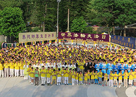 香港法轮功学员在长沙湾游乐场举行集会,向法轮功创始人李洪志先生贺寿,并庆祝世界法轮大法日。