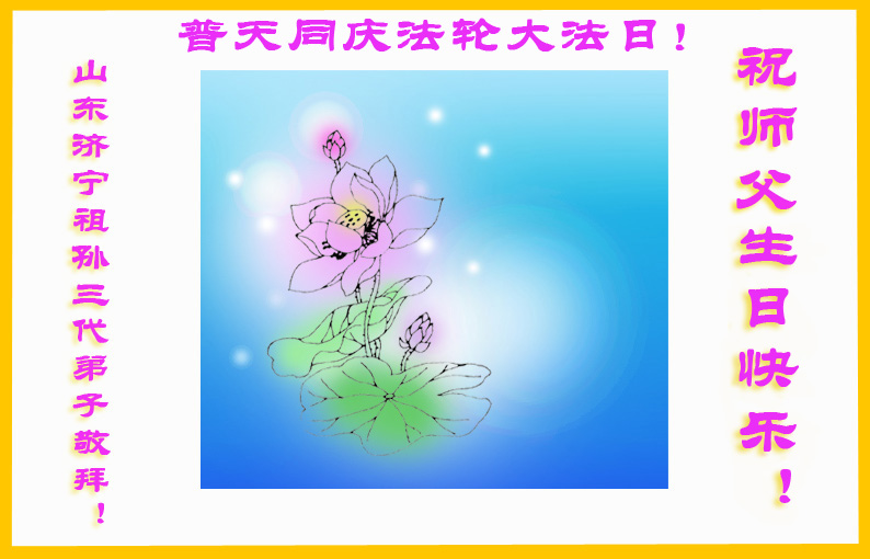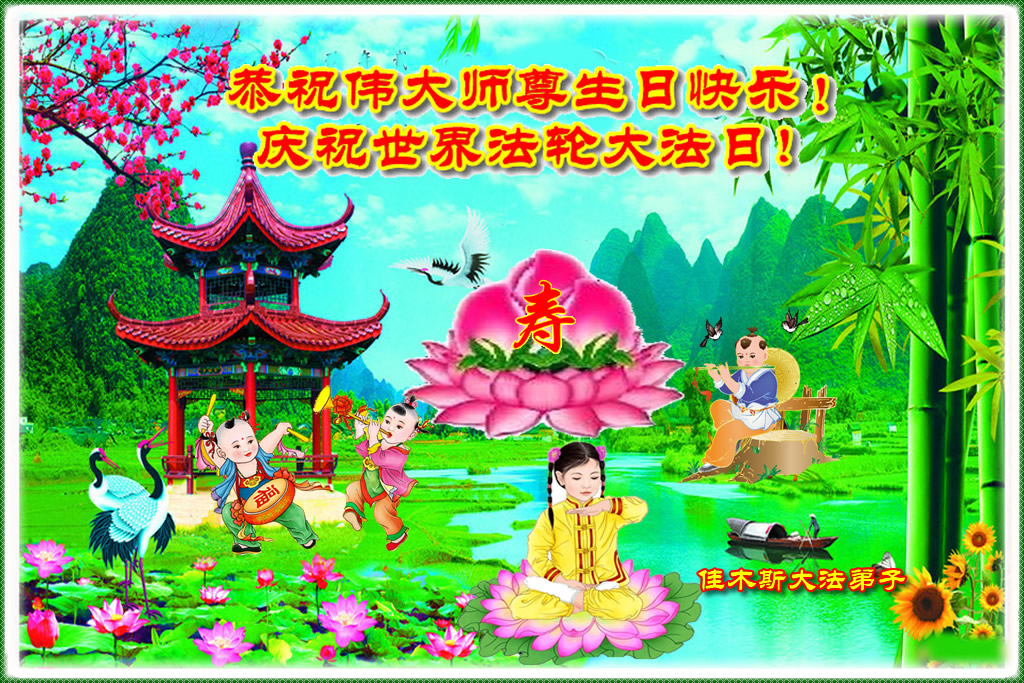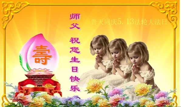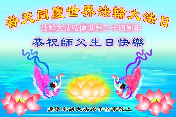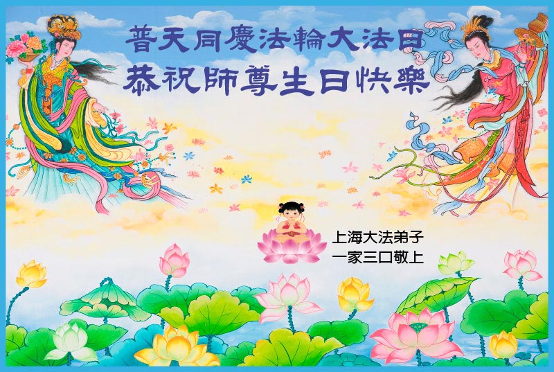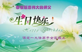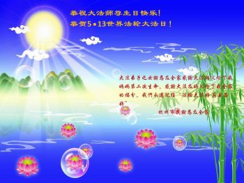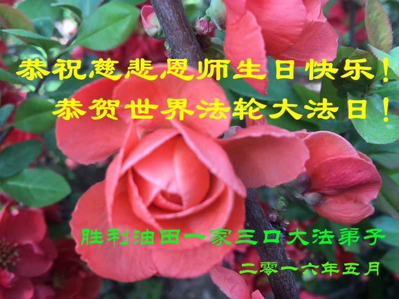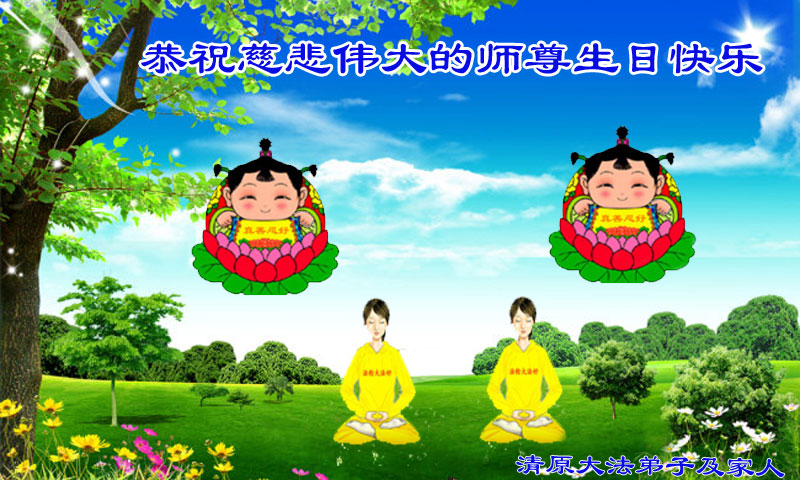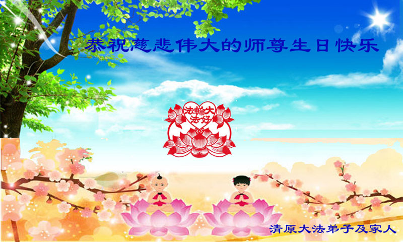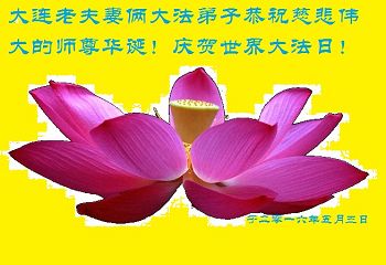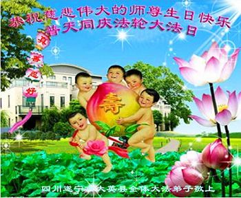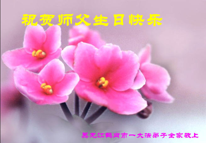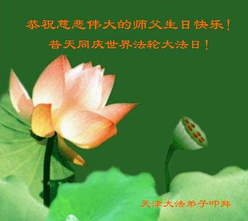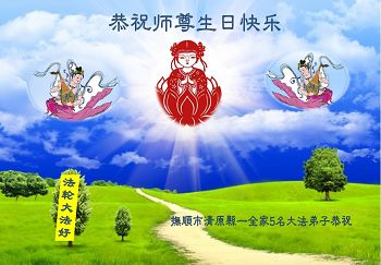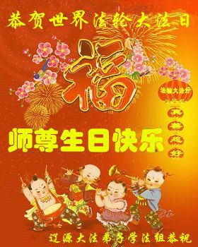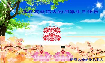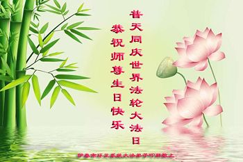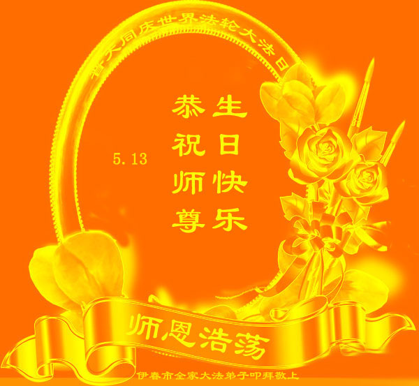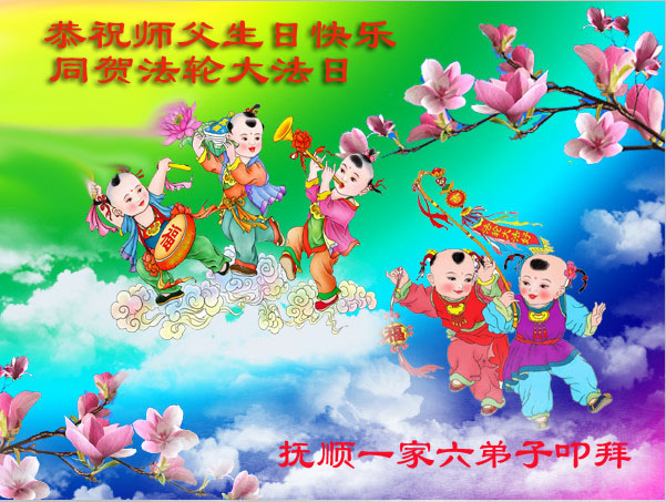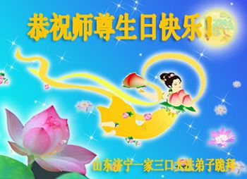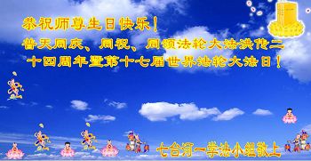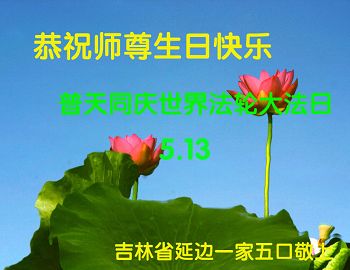 恭贺第十七届世界法轮大法日!恭祝李老师六十五华诞!祝李老师生日快乐!我们全家叩谢李老师赐予的福份!希望法轮功真相能尽快大白于天下,我们满怀喜悦迎接人类新纪元的到来!