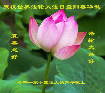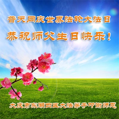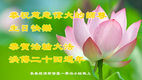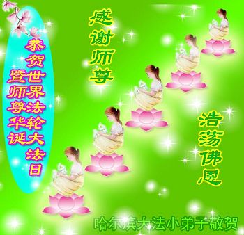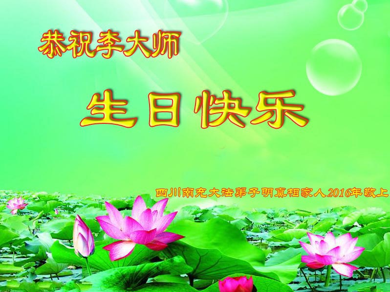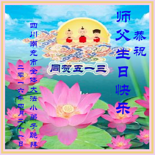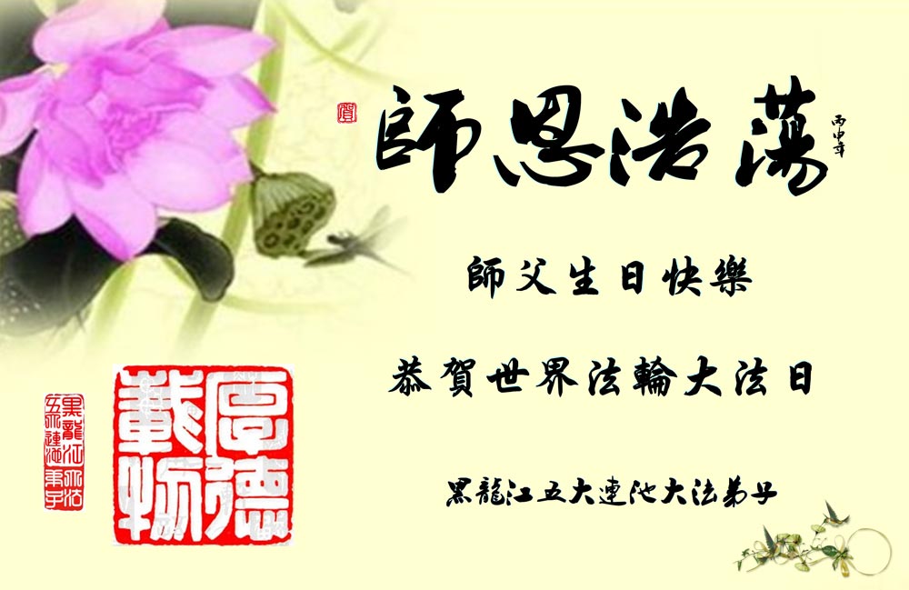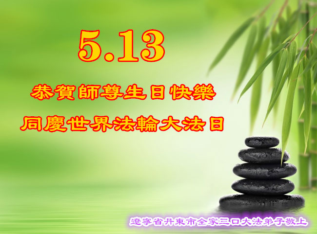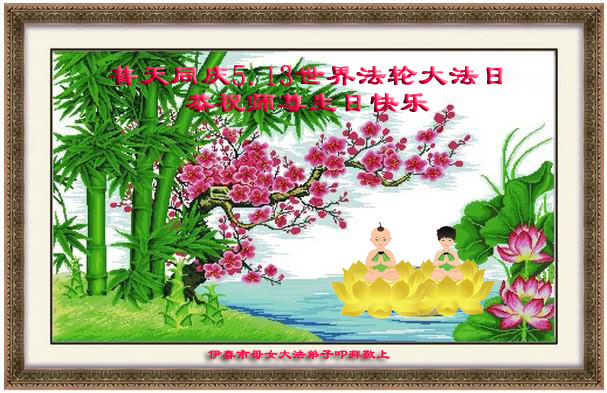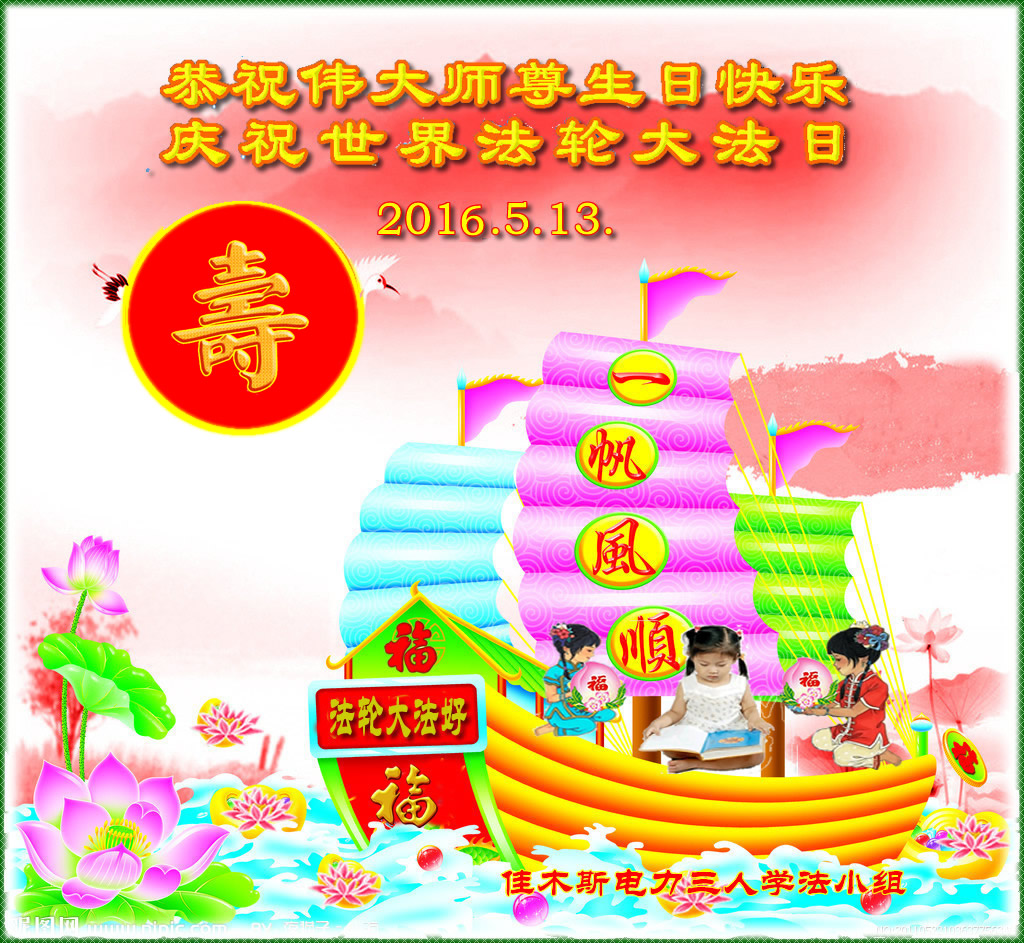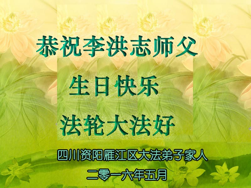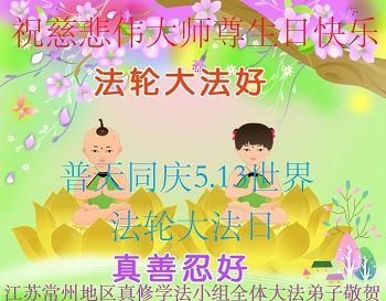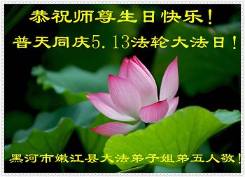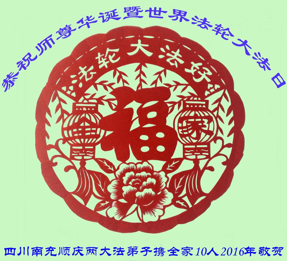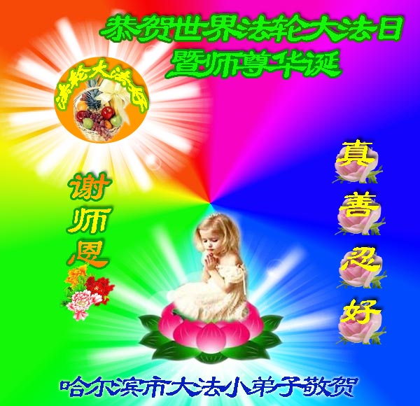 恭贺第十七届世界法轮大法日!恭祝李老师六十五华诞!祝李老师生日快乐!我们全家叩谢李老师赐予的福份!希望法轮功真相能尽快大白于天下,我们满怀喜悦迎接人类新纪元的到来!
