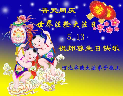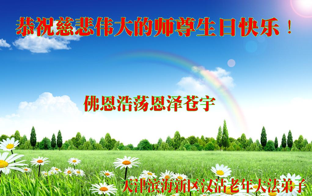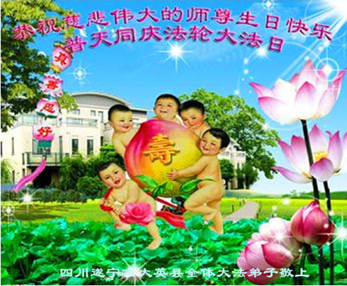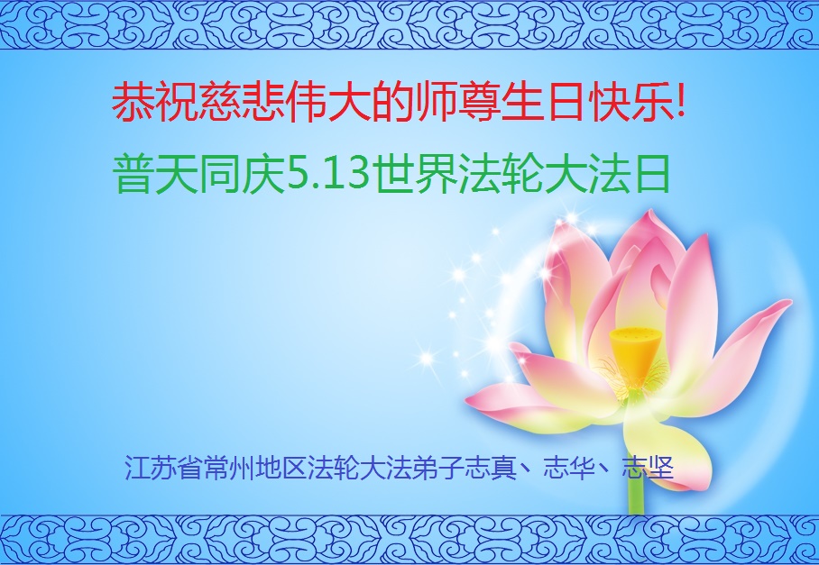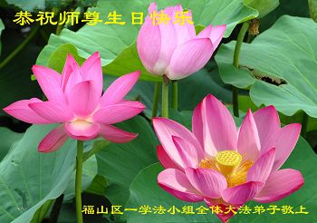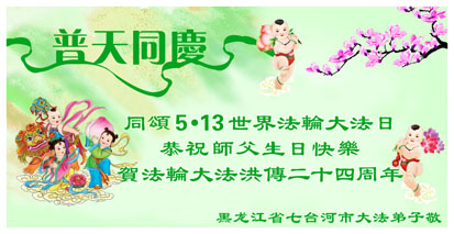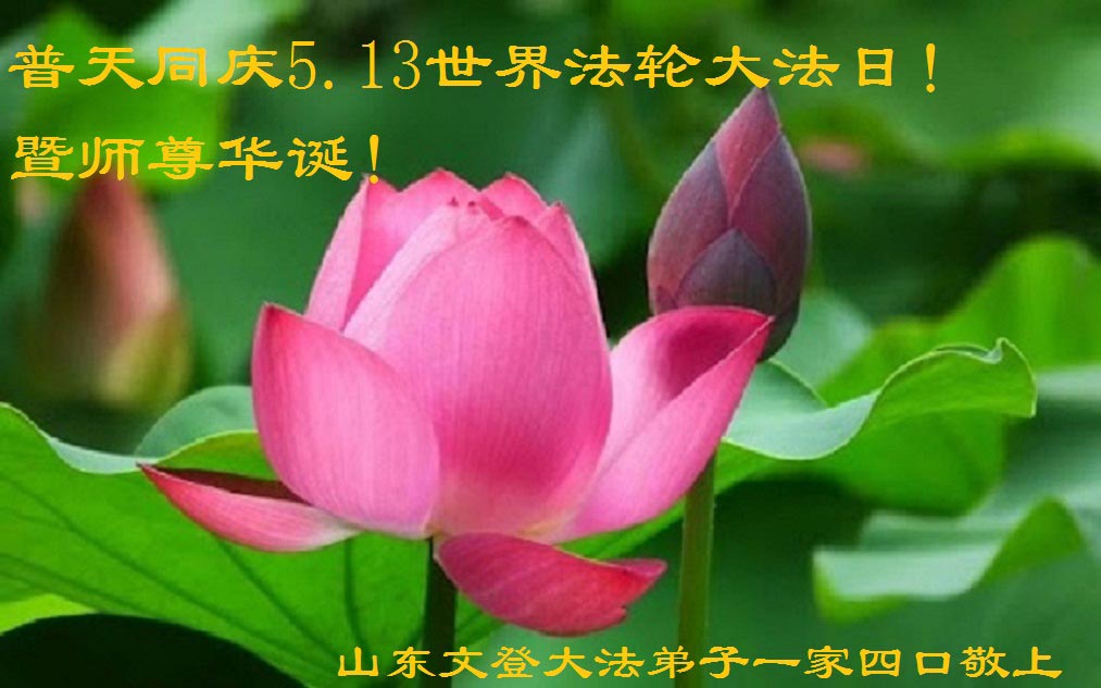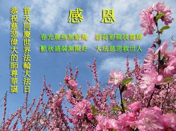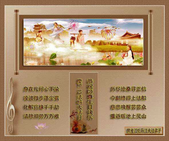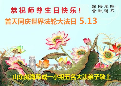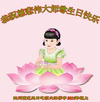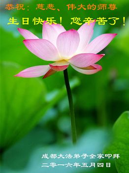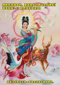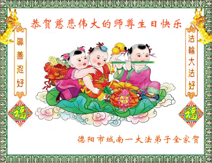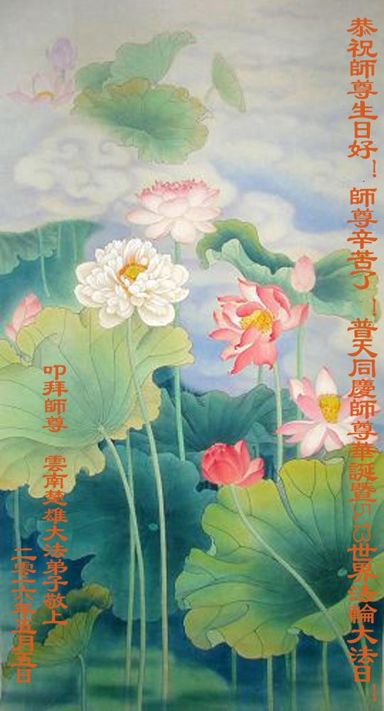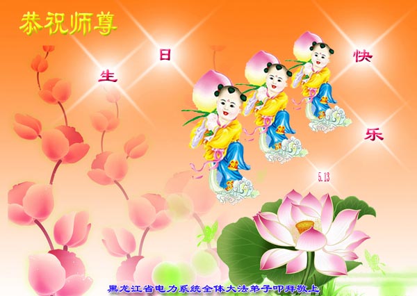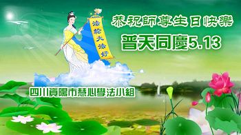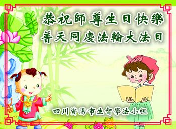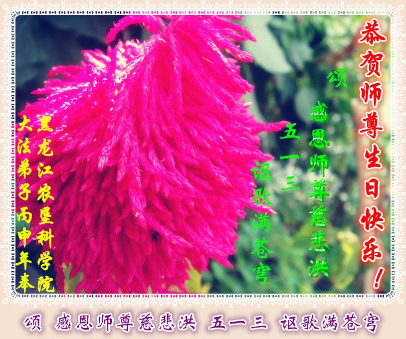 恭贺第十七届世界法轮大法日!恭祝李老师六十五华诞!祝李老师生日快乐!我们全家叩谢李老师赐予的福份!希望法轮功真相能尽快大白于天下,我们满怀喜悦迎接人类新纪元的到来!