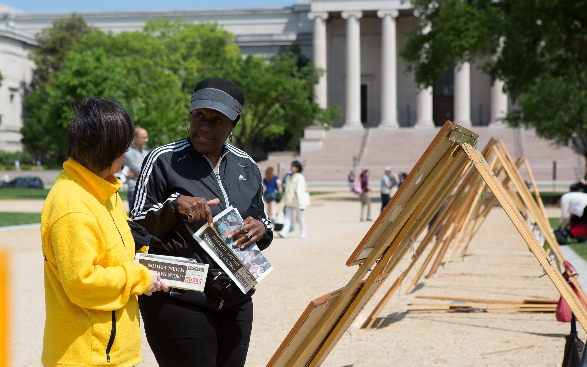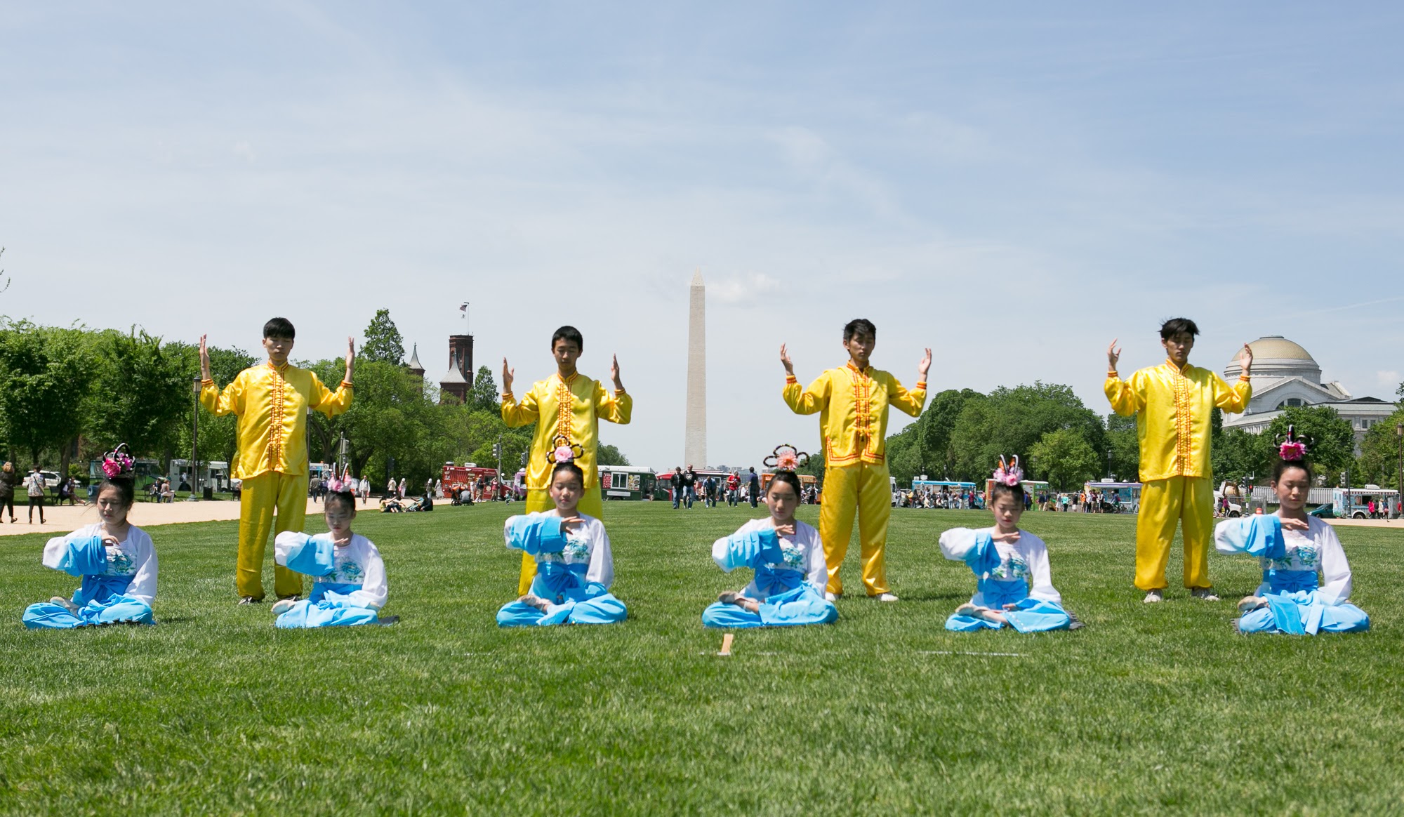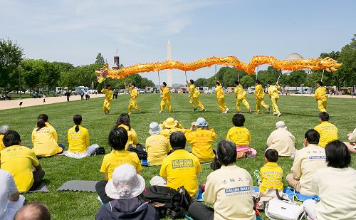 庆祝活动吸引了来自世界各地的游人驻足。不少过路者也兴趣盎然地观看,学习合十、结印、抱轮等炼功动作。也有游人与草坪上静坐炼功的人群“合影”留念。还有三位从上海来的游客在庆典现场当场化名退出了共产党、共青团与少先队。