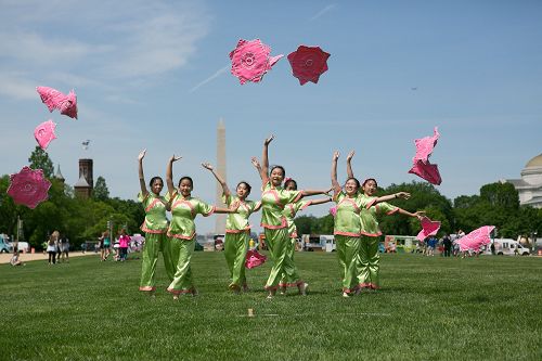 今年是第十七届世界法轮大法日,也是法轮大法洪传二十四周年暨法轮功创始人李洪志先生六十五岁华诞。在当天的庆祝活动上,法轮功学员在集体炼功之后,还表演了唐鼓、独唱、中国传统舞蹈、小提琴独奏、武术表演、合唱、琵琶演奏和腰鼓等节目。
