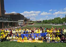 五月八日,费城法轮功学员在自由钟景点附近的独立公园庆祝了世界法轮大法日,庆祝和感恩法轮大法传世二十四周年。