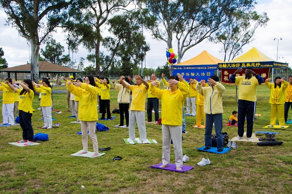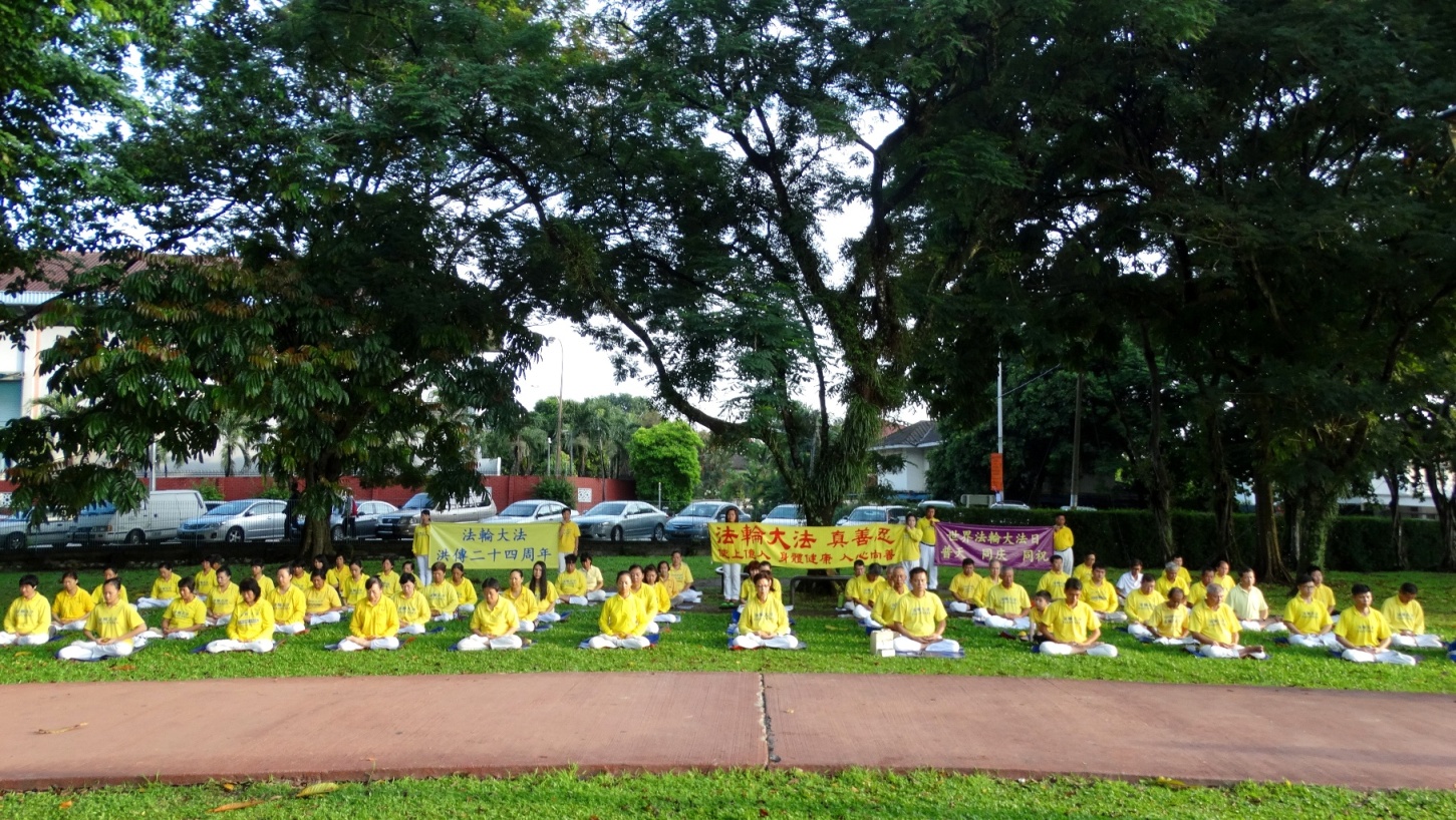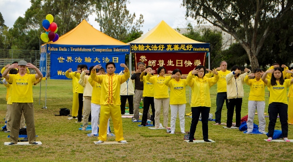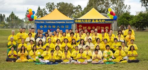 上午,法轮功学员在长沙湾游乐场进行集体大炼功、天国乐团演奏《法轮大法好》、 《法轮圣王》、 《佛恩圣乐》、 《神圣的歌》等多首乐曲,腰鼓队充满喜庆的表演,以及全体学员以无限感恩的心齐声谢师恩,恭祝李洪志先生华诞。至中午时分,庆祝集会结束之后,旋即整队于下午二点展开大游行。