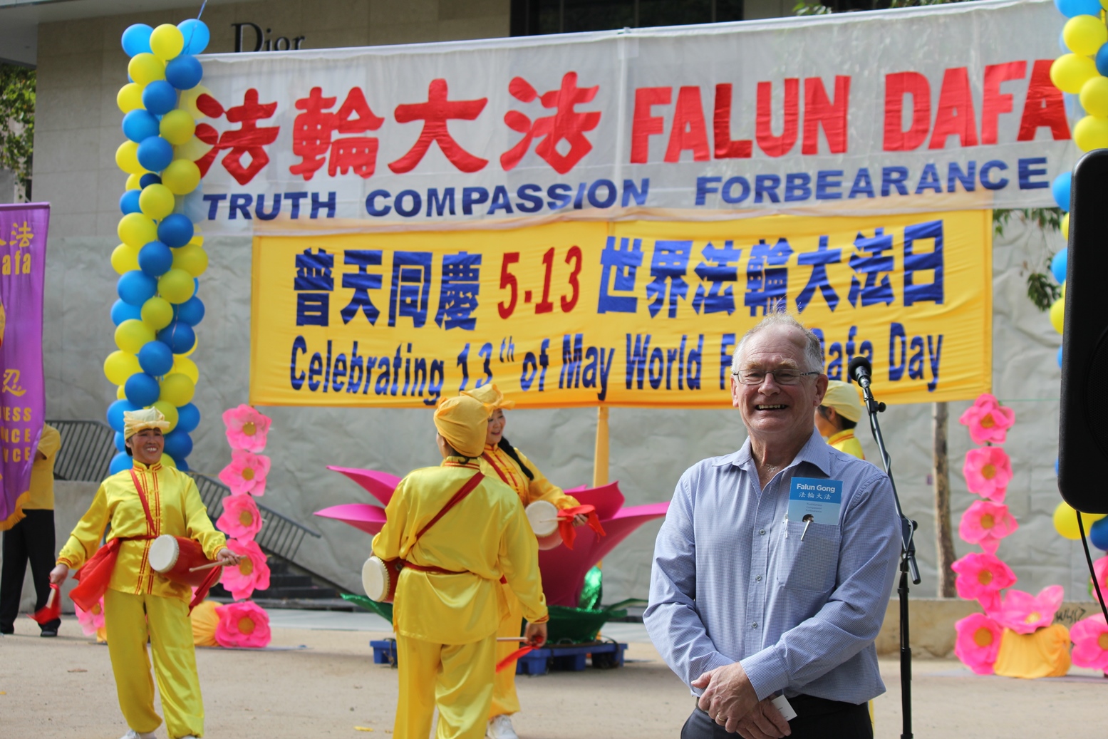 第一方阵明示“大法洪传 普天同庆”,告诉世人“世界需要真善忍”,并以历史实证图片的幡形海报,向世人展现“法轮大法洪传海内外、超过一亿人身心受益”的事实。