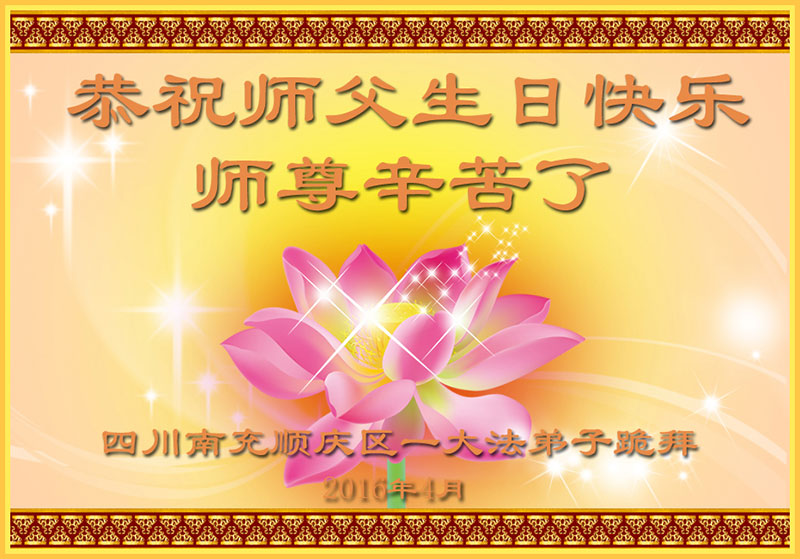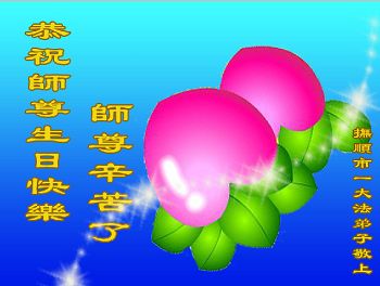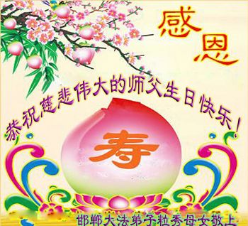 我是一个在校学生,我真心希望在我们中国能有一个自由的修炼环境,不要歧视修炼法轮大法的人。我母亲是其中的一个,父亲经常提出要离婚,我生活在这个家,只有得到母亲给予我的爱,父亲是个胆小怕事的人,经常逼母亲放弃修炼大法。母亲修炼大法后得到的身体健康,为这个家付出太多太多,这是我打心眼里佩服的坚强的母亲,谢谢师父教了一个好徒弟——母亲,师父——作为小弟子的我,我真心的谢谢您!在此祝师父生日快乐!在心里送上真诚的祝福和问候:师父——您辛苦了!同祝法轮大法洪传世界二十四周年!