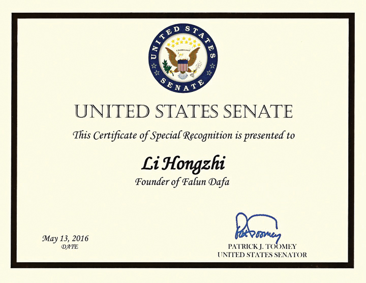 宾州的美国国会参议员帕特里克.图米(Patrick J. Toomey)给法轮大法创始人李洪志先生颁发的表彰证书。