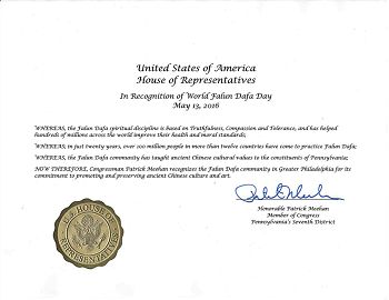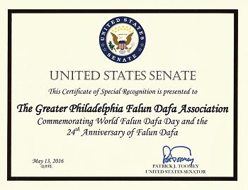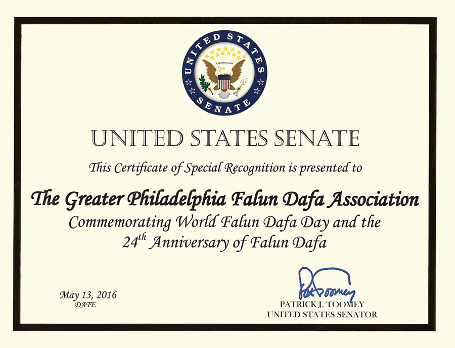 宾州的美国国会参议员帕特里克.图米(Patrick J. Toomey)给大费城法轮大法学会颁发的表彰证书