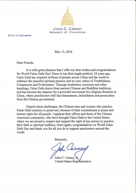 德拉华州美国国会众议员约翰.卡尼(John Carney)祝贺法轮大法日