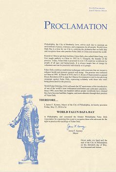 鉴于,由李洪志先生于1992年5月创立的法轮大法,是一种高层次的身体、心灵和精神修炼,由包括打坐在内的五套祥和的功法组成,以及遵循真、善、忍的原则。自创立以来,法轮大法已经在全世界广为洪传,并在1998年传到费城。大费城法轮大法学会所提供的最高质量的服务已经获得公认,本着公平、值得信赖和廉正的原则,大费城法轮大法学会已经成为了一个社区领袖和值得效仿的楷模。多年来,该协会的组织者和成员为其成长和发展做出了巨大贡献。