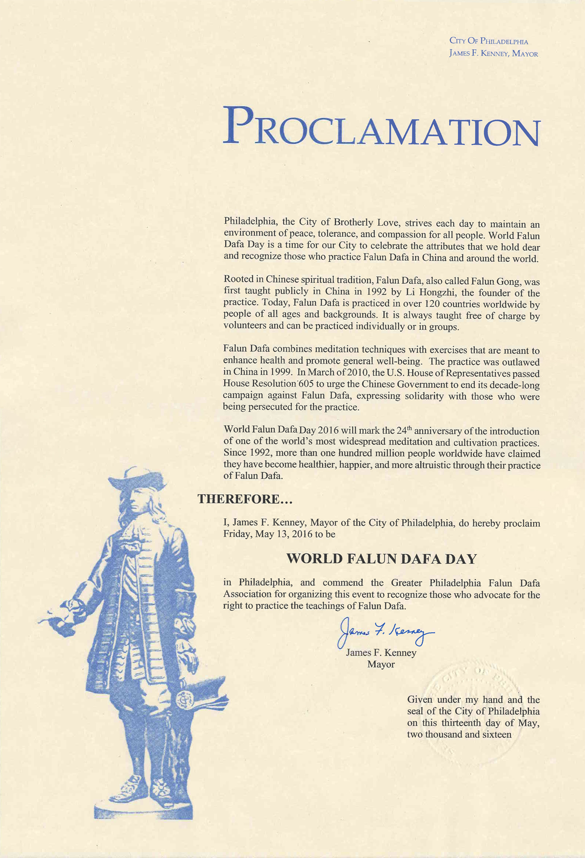 作为美国自由精神发源地的费城,市长詹姆斯•肯尼(James Kenney)颁发褒奖,宣布2016年5月13日为世界法轮大法日,赞扬法轮大法给该城市、宾州,以及全世界人民带来的福音。