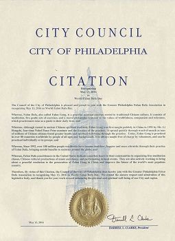 费城市议会也颁发褒奖,祝贺世界法轮大法日。褒奖中说:
