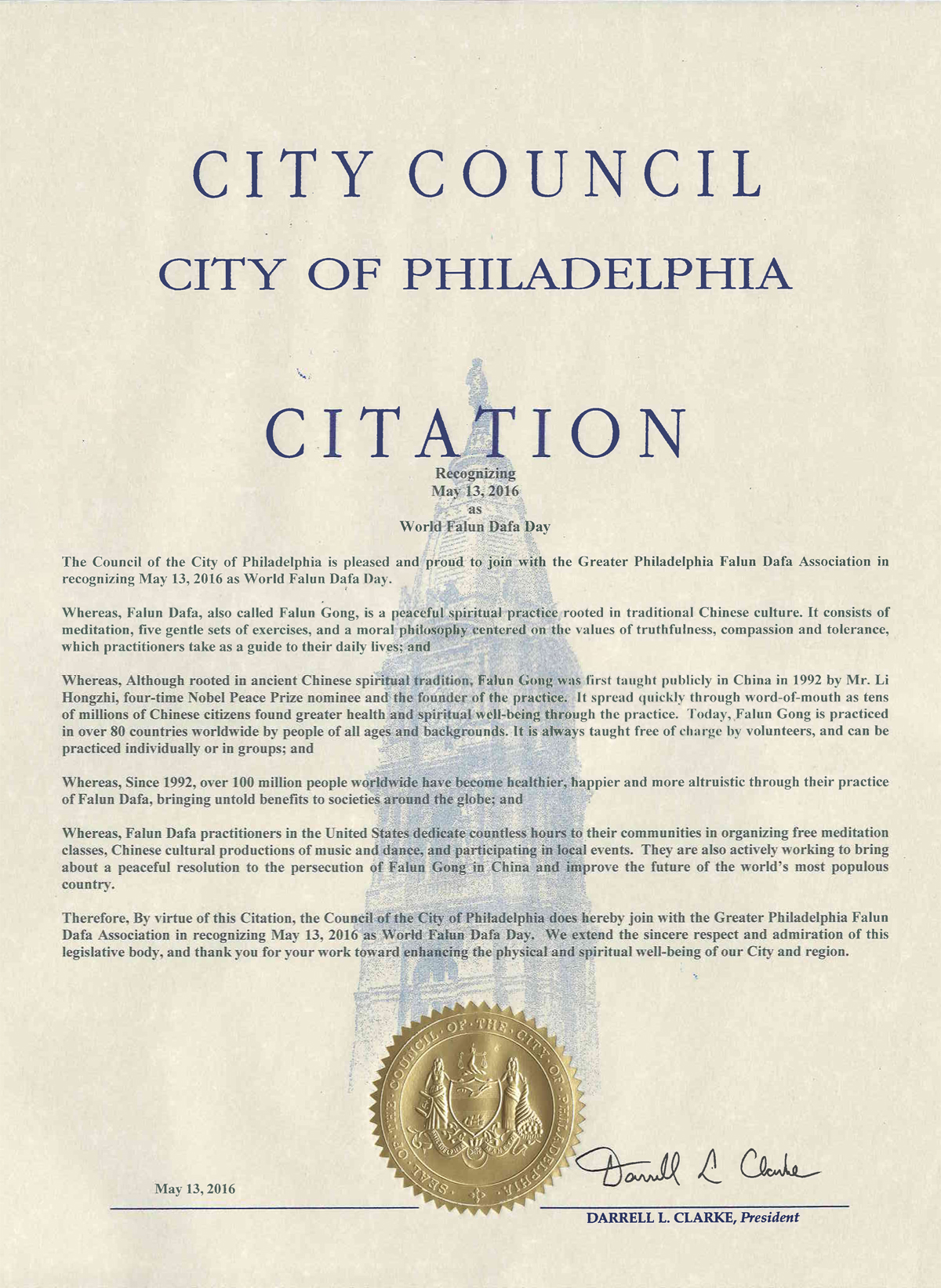 因此,费城市议会和大费城地区法轮大法学会在此一起庆祝2016年5月13日世界法轮大法日。作为立法机构,我们希望这份真诚与祝愿,以及对你们付出的感激会给我们这个城市和地区带来健康与精神上的提升。