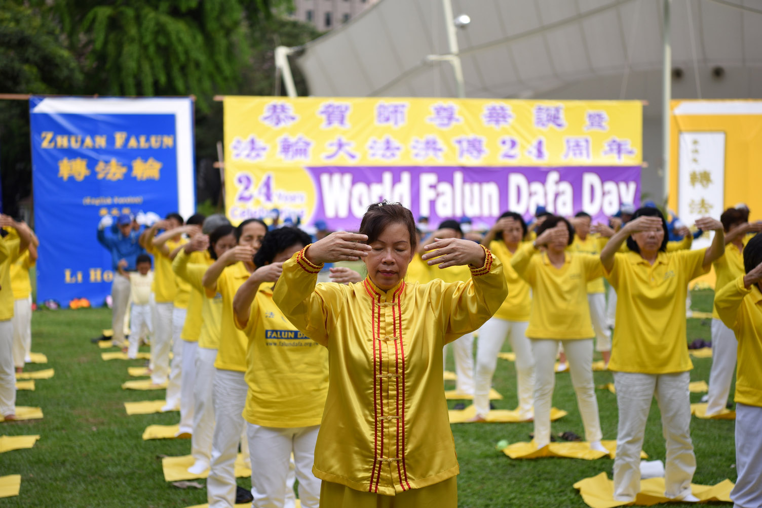 ![]() 图2-3:新加坡法轮功学员集体炼功庆祝世界法轮大法日,与民众分享大法的美好。 |