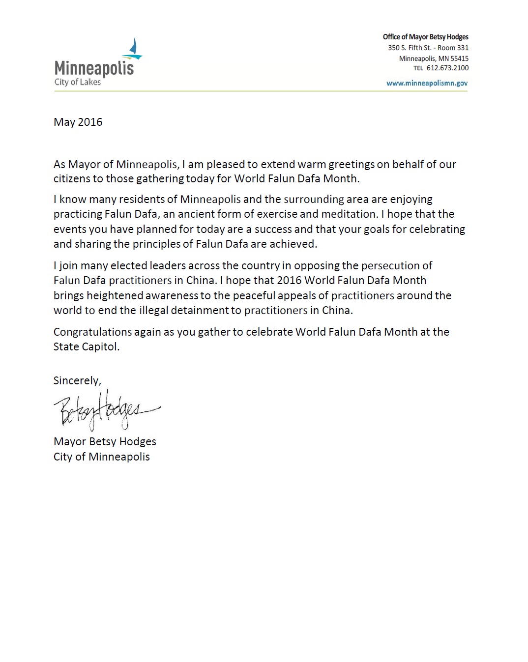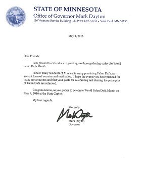 我知道很多明尼阿波利斯市和周边地区的居民们喜爱修炼法轮大法,这一古老的打坐修行方式。我希望你们计划的庆祝活动获得成功,你们庆祝并分享法轮大法修炼原则的目标得以实现。