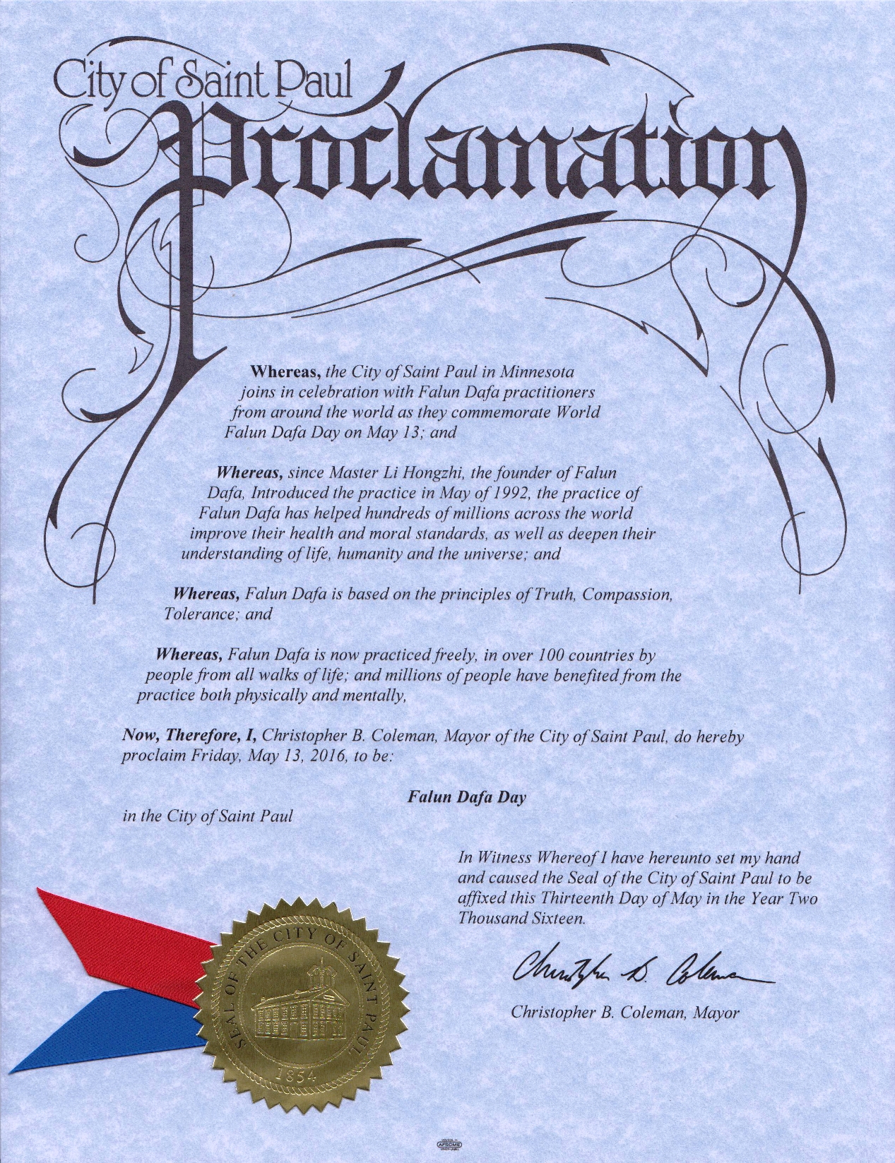 因此,现在,我,圣保罗市市长,克里斯托弗·科曼,宣布2016年5月13日,为圣保罗市的法轮大法日。