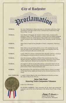 鉴于,明尼苏达州罗切斯特市加入全世界法轮大法修炼者共同庆祝5月13日的世界法轮大法日;