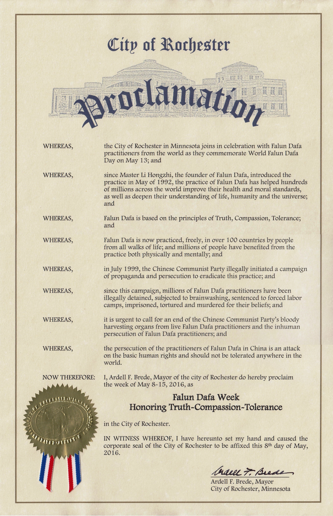 因此,现在,我,阿戴尔·布雷迪,罗切斯特市市长,为褒奖真、善、忍,宣布2016年5月8日至15日这一周,为罗切斯特市市的法轮大法周。