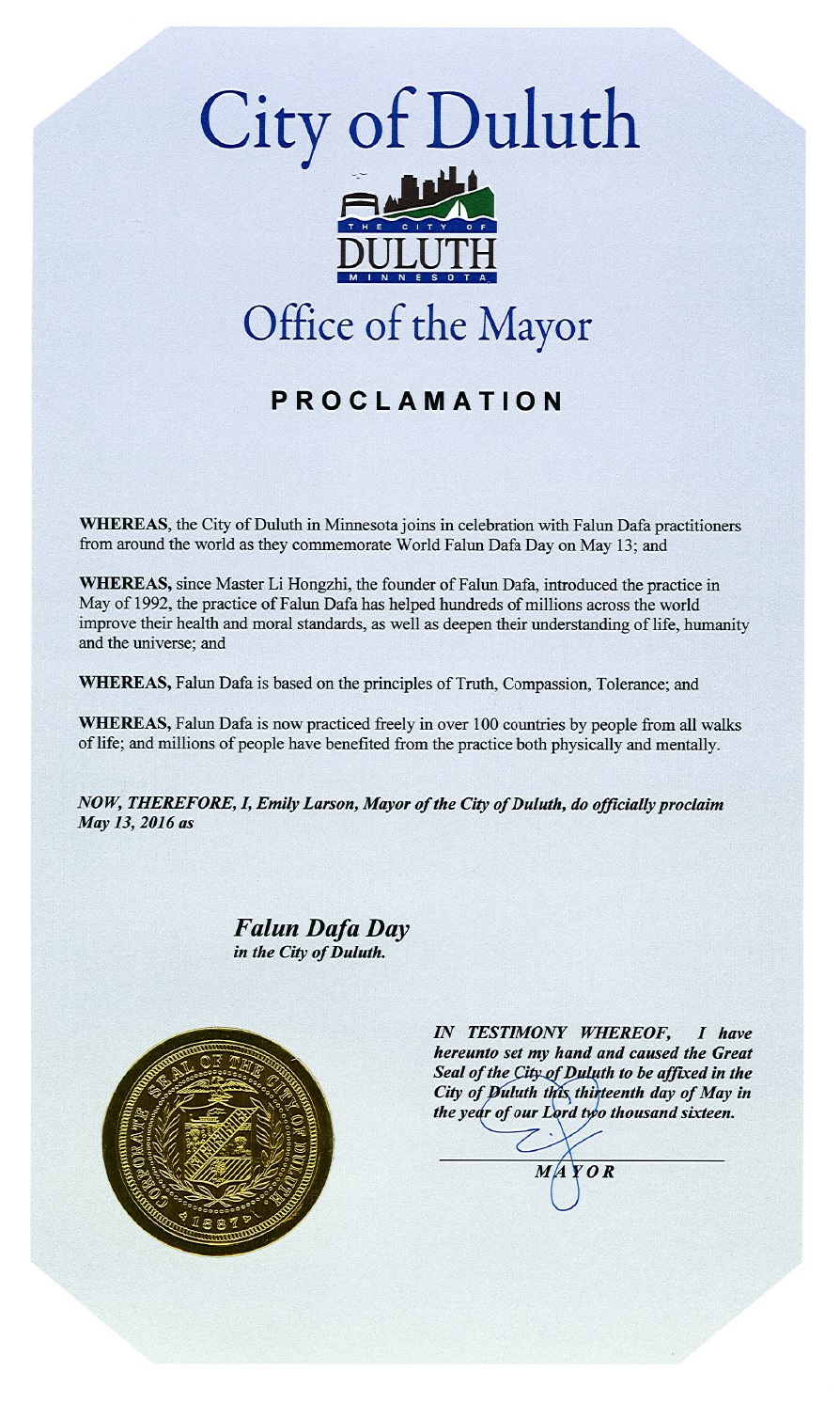 因此,现在,我,艾米莉·拉尔森,迪庐斯市市长,正式宣布2016年5月13日这一天,为迪庐斯市的法轮大法日。