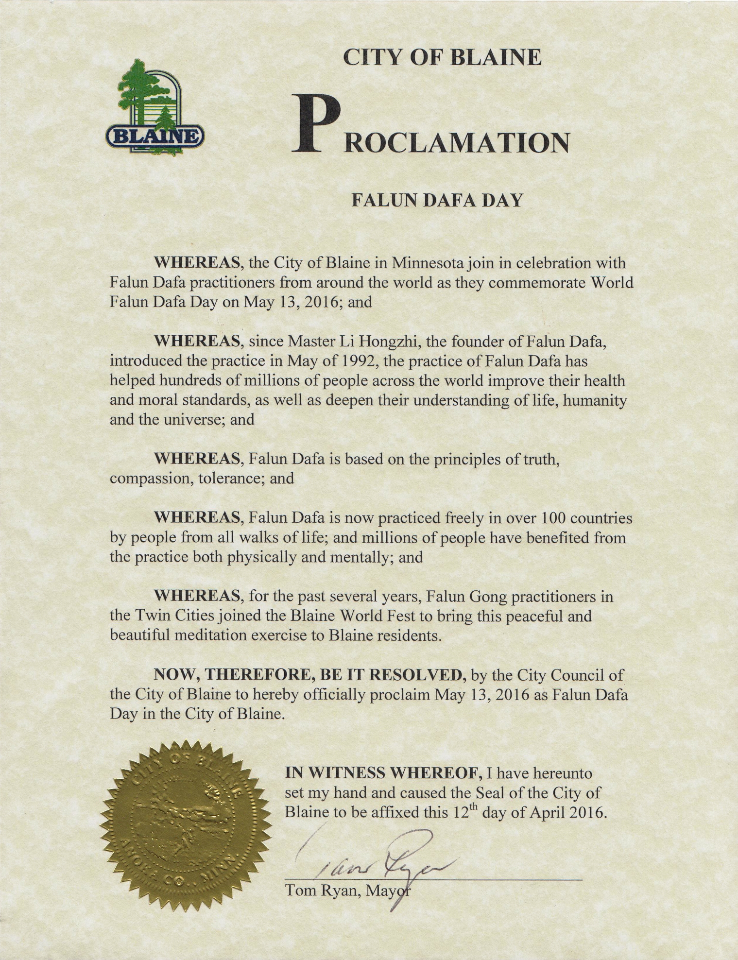 鉴于,明尼苏达州布莱恩市加入全世界法轮大法修炼者共同庆祝2016年5月13日的世界法轮大法日;
