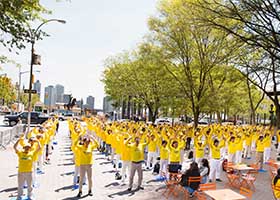 五月十二日,来自世界各地的部分法轮功学员来到联合国达格•哈玛绍广场公园集体炼功,庆祝法轮大法日,跟各界民众分享法轮大法的美好。