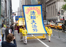 五月十三日,近万名来自五十三个国家不同族裔的法轮功学员在美国纽约举办的大游行予以庆祝,令道路两旁观众感到非常震撼。