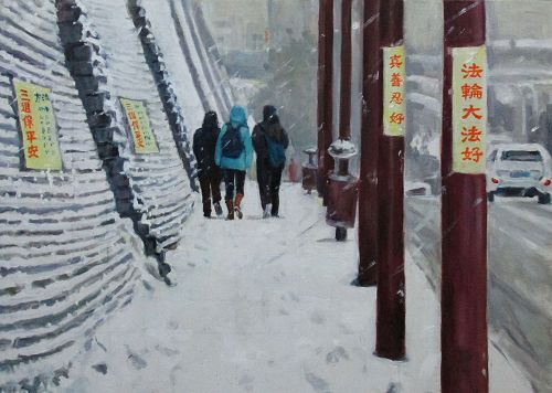 大法弟子在寒风雪雨中,迅速贴出了救人的真相标语后转身离去,反映了大法弟子救众生的慈悲之意。