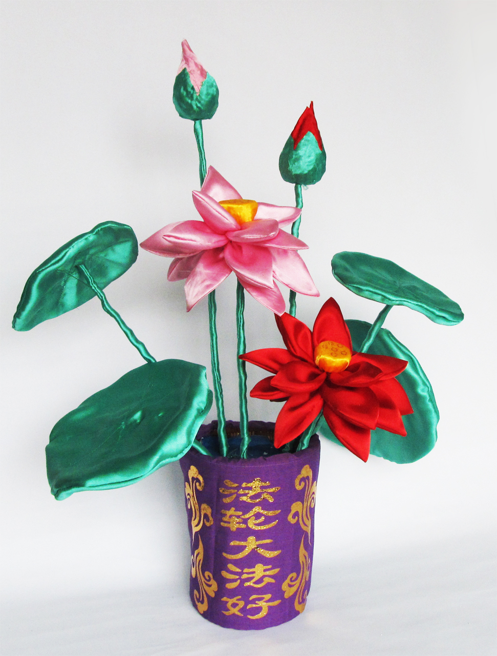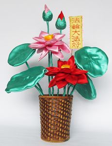 说明:莲叶、花瓣、花茎、骨朵、莲蓬,都是法轮功学员亲手做的,象征在大法修炼中的法轮功学员在不断纯净自己的同时,愿将大法的美好带给更多的人。