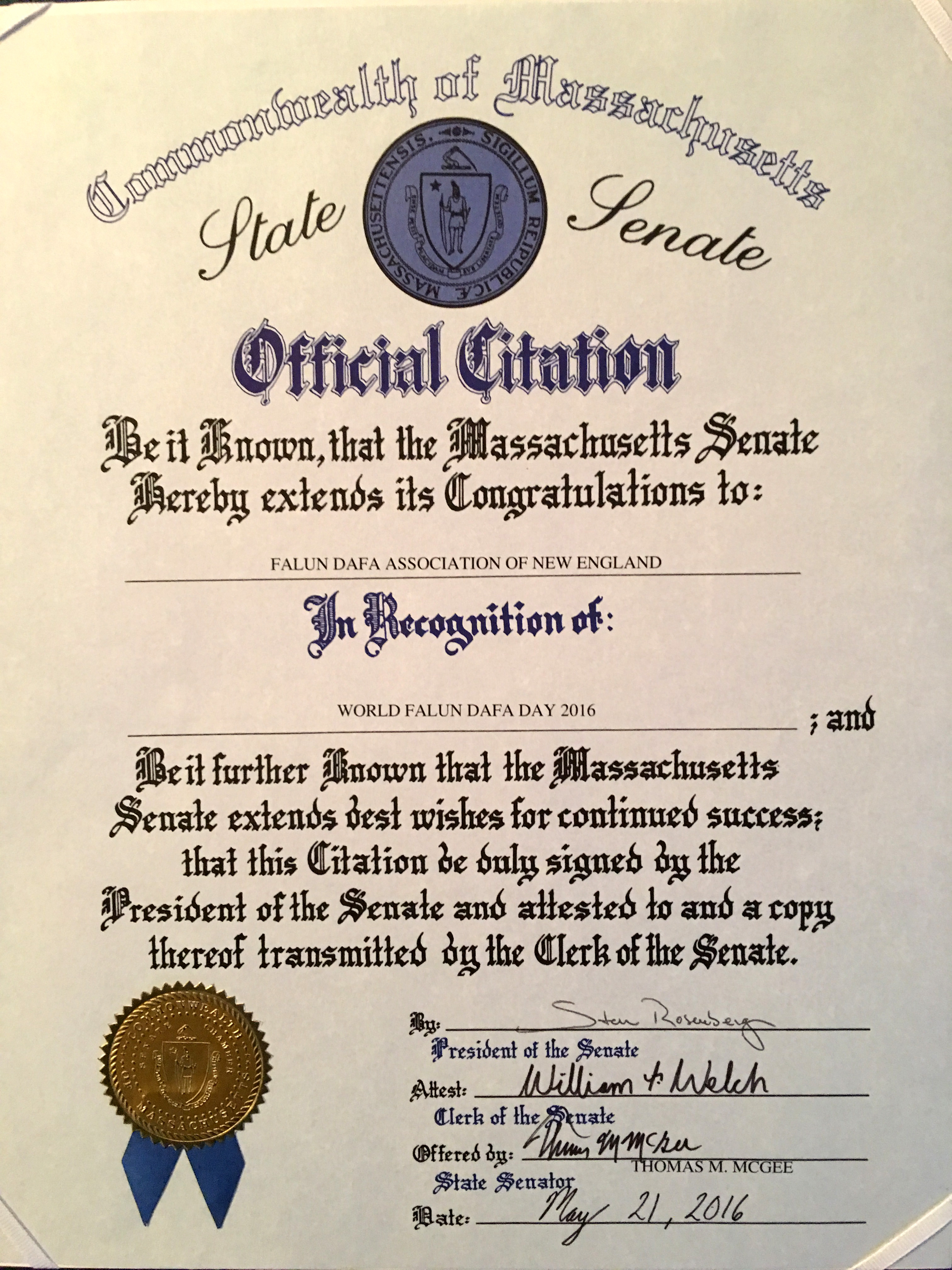 褒奖状中说,值此二零一六年世界法轮大法日之际,麻萨诸塞州参议院谨向新英格兰法轮大法学会表示祝贺。麻萨诸塞州参议院并祝法轮大法学会继续成功。