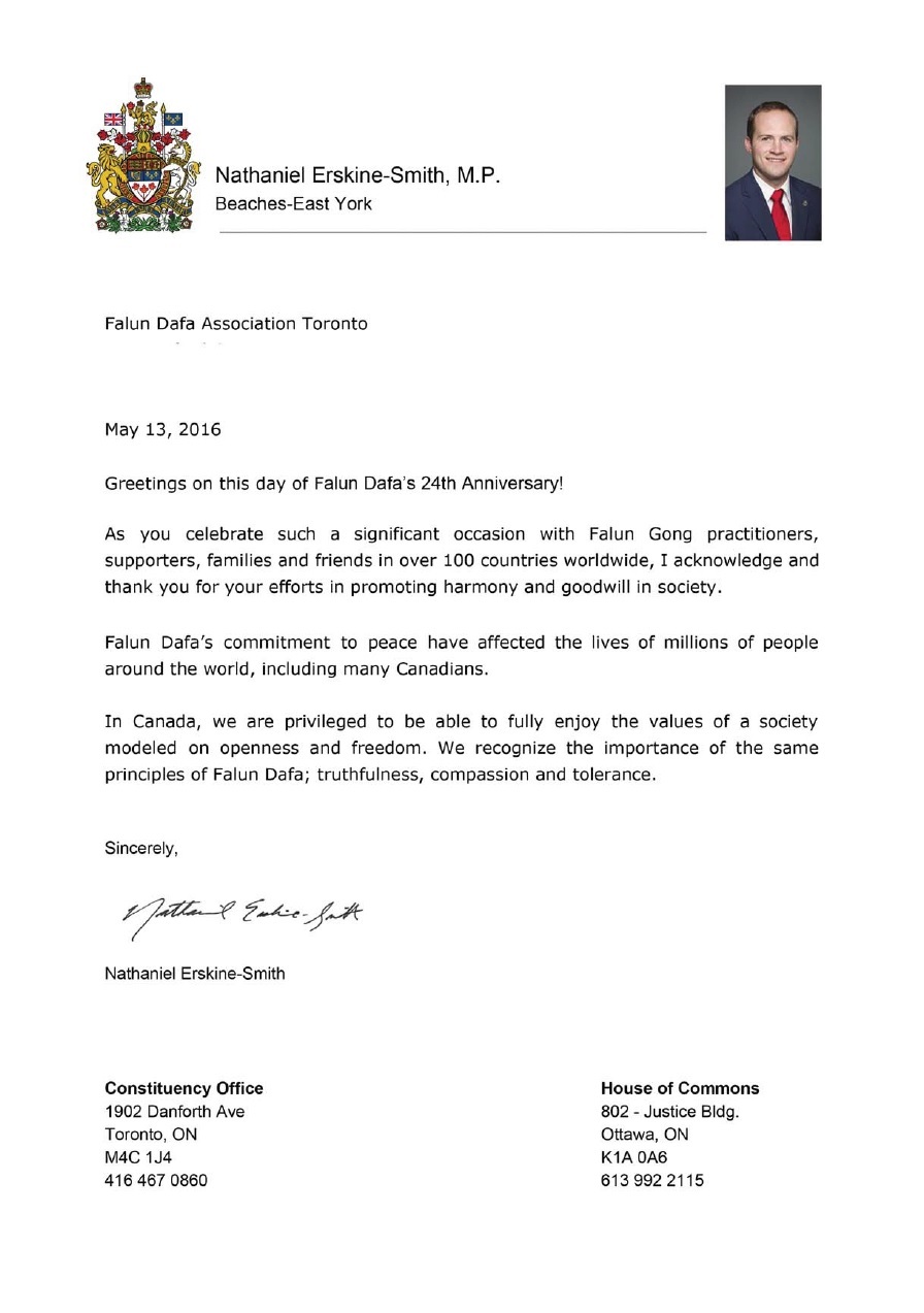 ![]() 国会议员厄斯金•史密斯(Nathaniel Erskine-Smith)的贺信 |