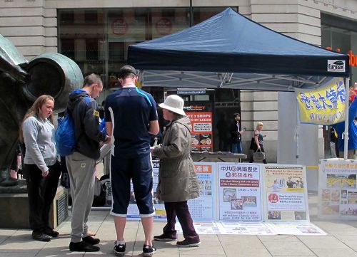 原来这是北英格兰的法轮功学员在这里展开每周一次的弘法、讲真相活动。炼功的几个年轻人中有西方人也有东方人。另外的人设立展桌,展开展板,有的向过往民众介绍来自中国的修炼功法——法轮功,也有的向路人揭露中共活摘法轮功学员器官牟取暴利的罪恶,并征集“反对活摘器官”的签名。