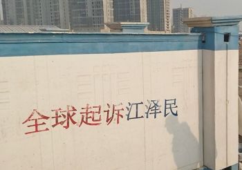 天津,二零一六年的春天有些不寻常,不仅出现了一处处配有天使、童子,莲花和大福字等图案的法轮大法真相标语,见明慧网报道:《希望之花开放在天津的春天》,还出现了正规的印在墙壁上的大型标语“全球起诉江泽民”,此标语长1.8m,宽0.3m.印在墙壁上的标语工整、干净,纯正的宋体字更显端庄。向世人展示了一个重要讯息——迫害法轮功的元凶江泽民必将被推上正义的审判台,世界各地正义的人们都在起诉他。