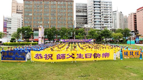 图1-3:台湾桃园约七百法轮功学员,于二零一六年五月七日在中坜区地标之一的中正公园,庆祝“世界法轮大法日”,并敬祝师尊生日快乐。
