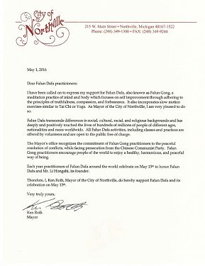 法轮功学员在面对中国共产党严酷的镇压时,仍然采取和平解决冲突的做法,是诺斯维尔市所推崇的。在最严厉的环境之下,法轮功学员仍鼓励世界人民享受健康、和谐和平安的生活。