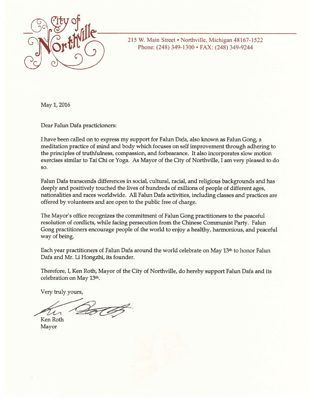因此,我,肯•罗斯,作为诺斯维尔市的市市长,特在此支持法轮大法,庆祝五月十三日法轮大法日。