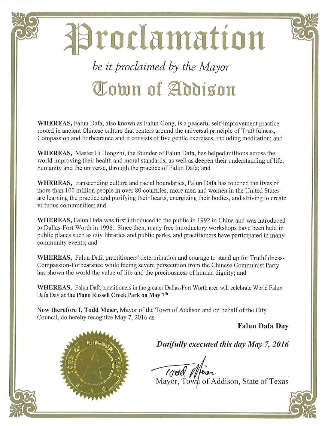 鉴此,我,陶德·密伊尔(Todd Meier),艾迪逊市市长代表市议会,宣布二零一六年五月七日为“法轮大法日”