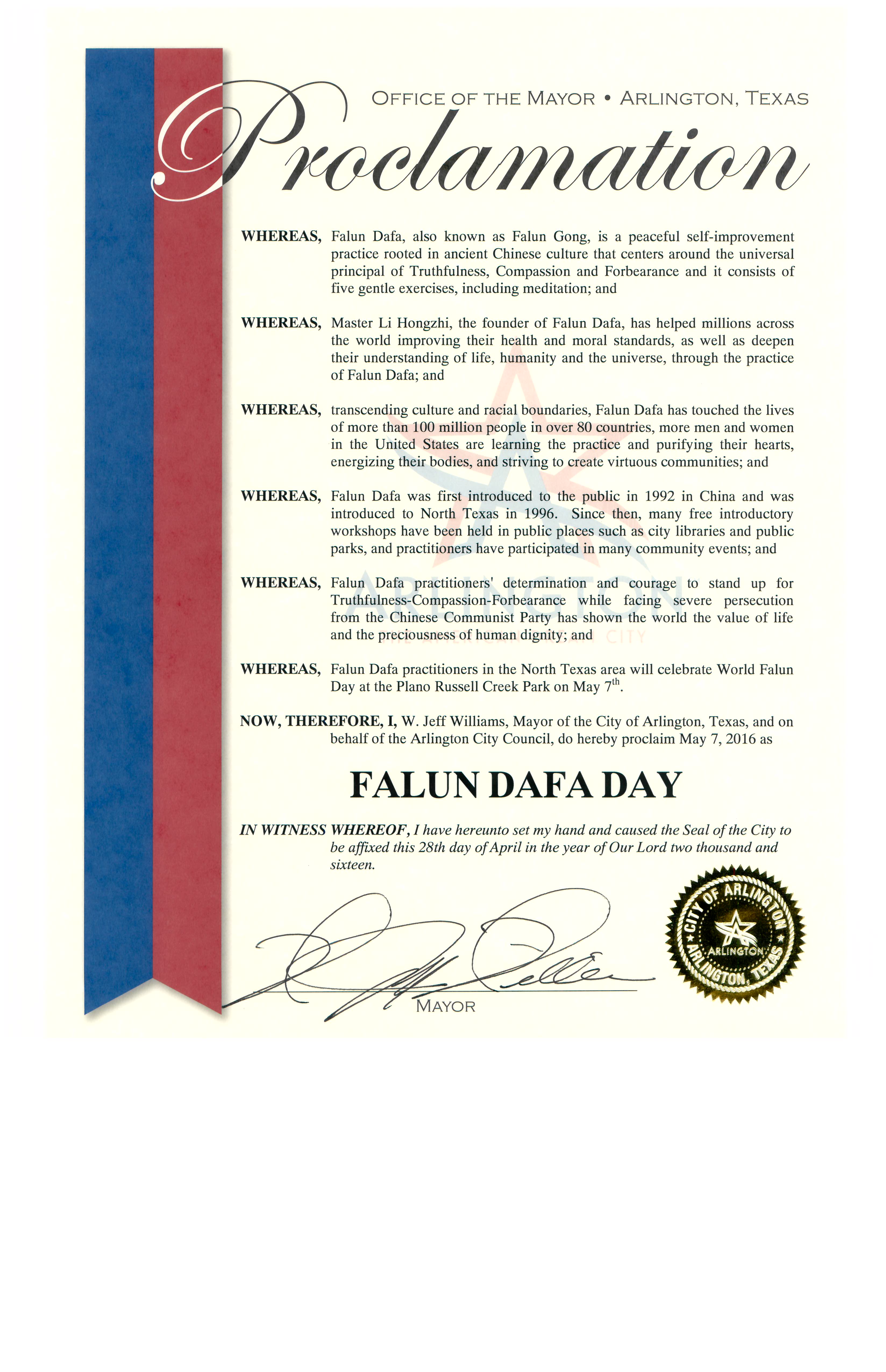 鉴此,我,杰夫·威廉穆斯(Jeff Williams),德州阿灵顿市市长代表市议会,宣布二零一六年五月七日为“法轮大法日”
