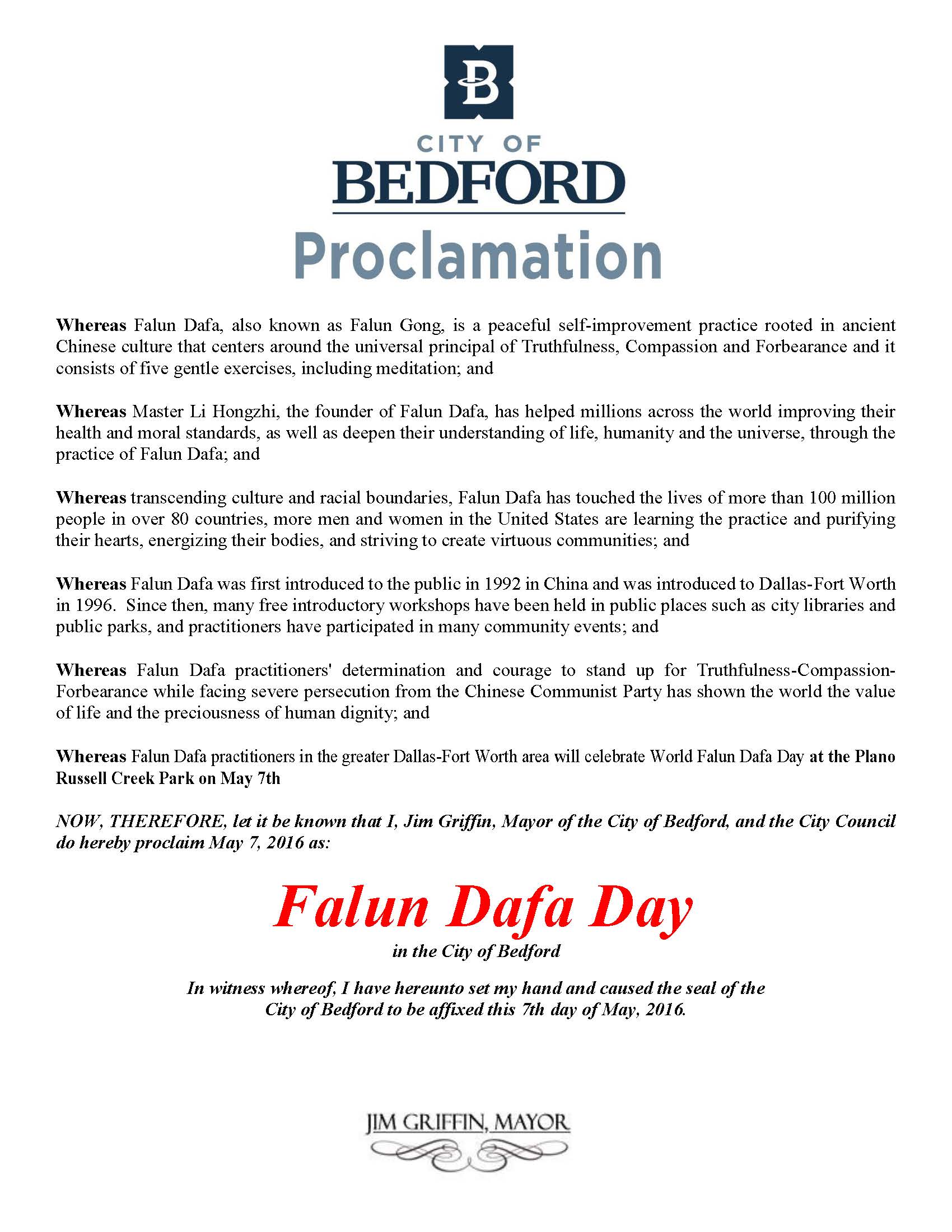 因此,我,吉姆·格里芬,伯德福特市市长及市议会,宣布二零一六年五月七日为“法轮大法日”