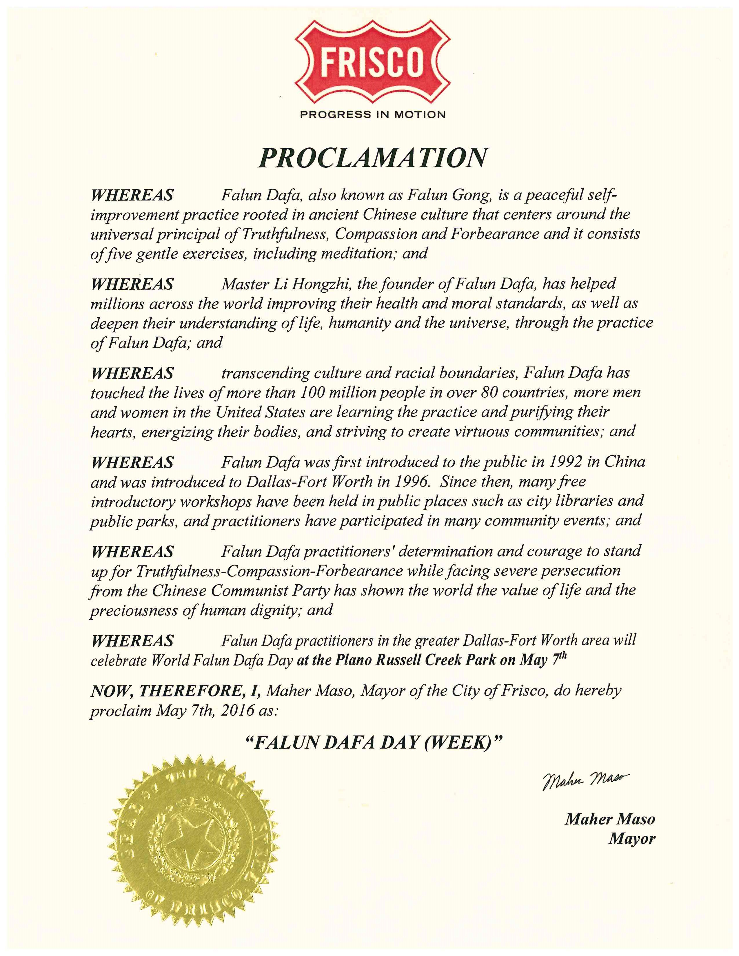 鉴此,我,马赫·马索(Maher Maso),弗瑞斯科市(Frisco)市长,宣布二零一六年五月七日为弗瑞斯科市“法轮大法日”。