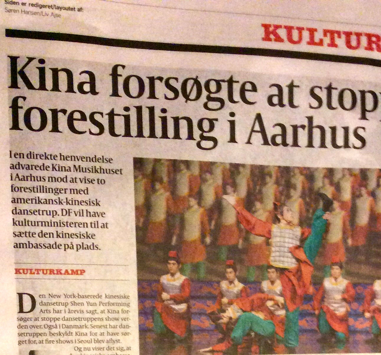 《政治报》的文章提到,“总部设在纽约的中国舞蹈公司神韵艺术团多年来一直告诫人们,中国(中共)试图阻止舞蹈团在世界巡回表演,其中包括在丹麦。近日,舞蹈团得到消息,迫于中共的压力,在首尔的四场神韵演出被迫取消。”