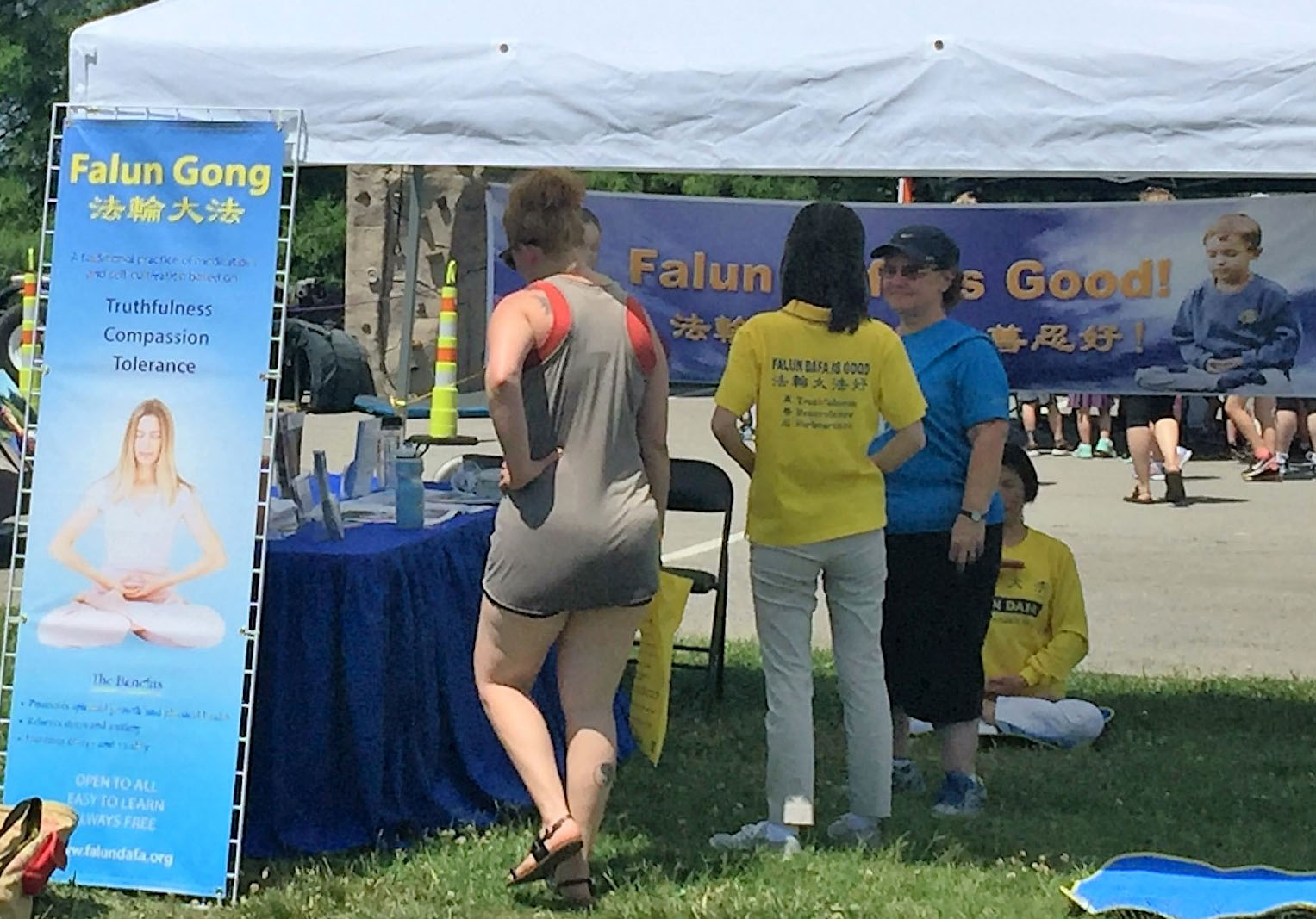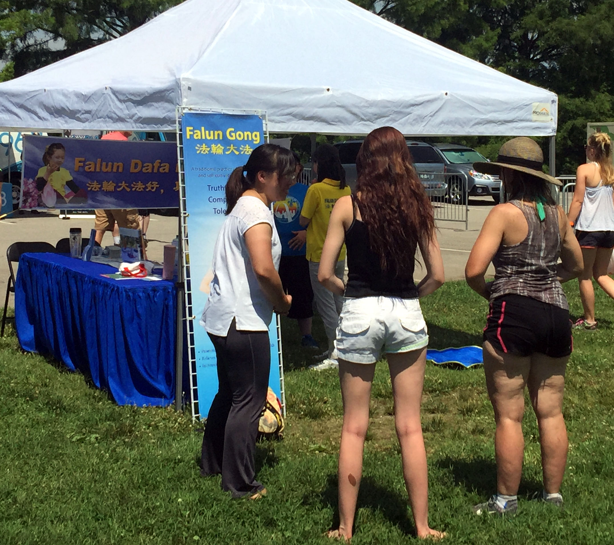 尽管天气非常炎热,也没能阻挡喜爱户外运动的人们前来参加活动。很多人都被法轮功缓慢优美的功法所吸引。前来学功和要资料的人络绎不绝。这些人有的练过中国武术,一直在寻找能够使自己减轻压力的方法,也有教授打坐的老师,还有以前在其它地方就已经听说过法轮功。有的人说只是看学员们演示功法,就能感受到法轮功净化身体的作用。